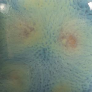 Kegel 06 Oxidation (1000°C): Blue Azure ist eine halbtransparente blau/grüne Basisglasur mit blauen und grünen Kristallen, die schmelzen, sowie kleinen blauen Sprenkeln.