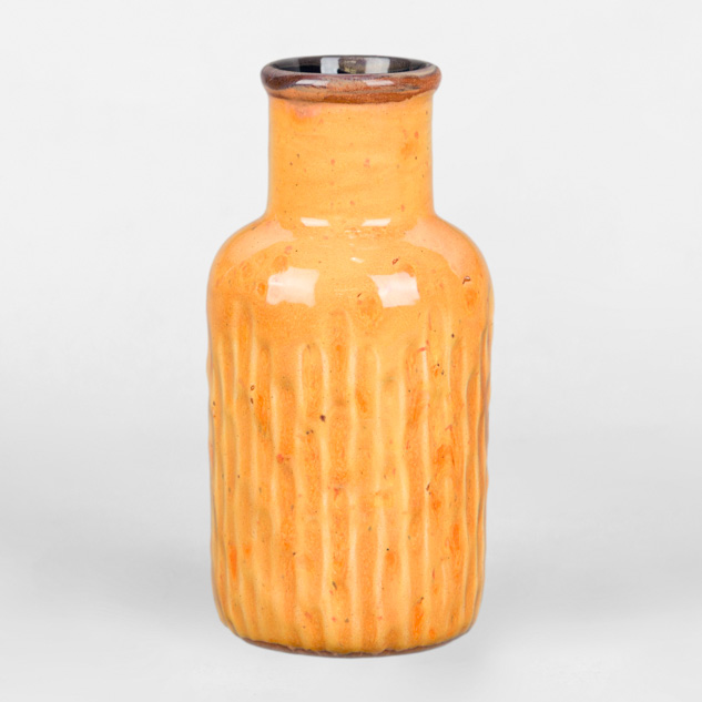 Kegel 06 Oxidation (1000 °C): Citrus Splash ist eine opake gelbe Basisglasur mit orangefarbenen Kristallen, die aufblühen, sowie orangefarbenen und braunen Sprenkeln.