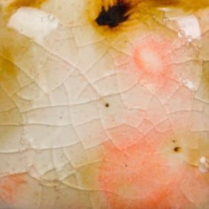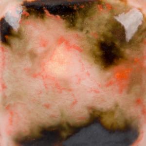 Kegel 06 Oxidation (1000°C): Day Lily ist eine durchscheinende, korallenfarbene Basisglasur mit großen gelben, orangefarbenen und schwarzen Kristallen.