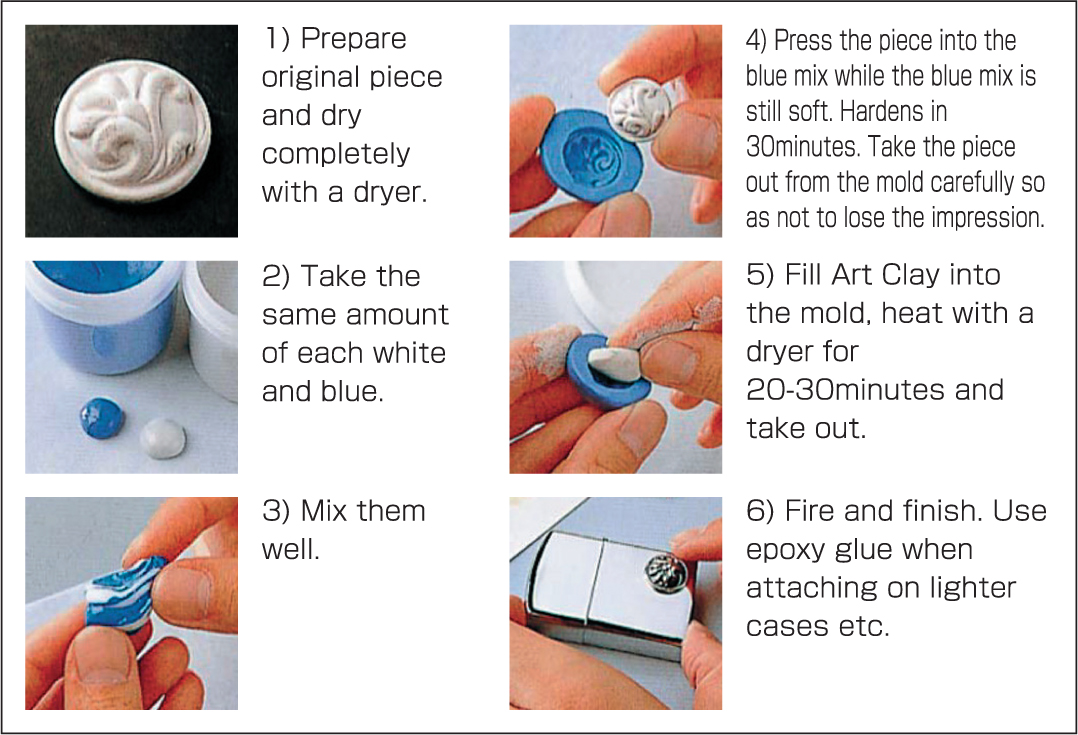 2-Komponenten Formmasse von Art Clay. Man nimmt gleiche Teile von jeder Masse und verknetet sie gründlich miteinander. Dann drückt man den Gegenstand in die Masse von der man einen Abdruck erstellen möchte. So erhält man einen weich und flexible Form, die man immer wieder benutzen kann.