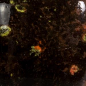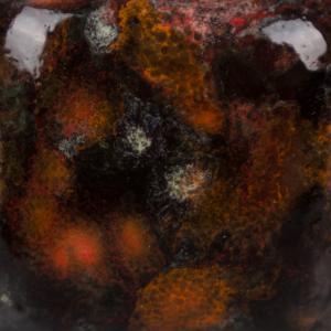 Kegel 06 Oxidation (1000°C): Masquerade ist eine opake, schwarze Basisglasur mit roten, orangefarbenen, gelben und grünen Kristallen, die schmelzen/aufblühen.