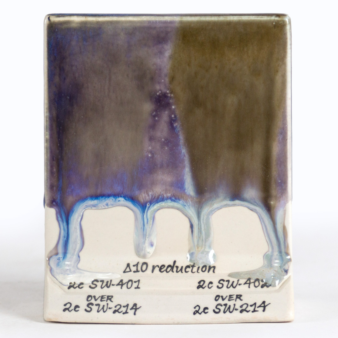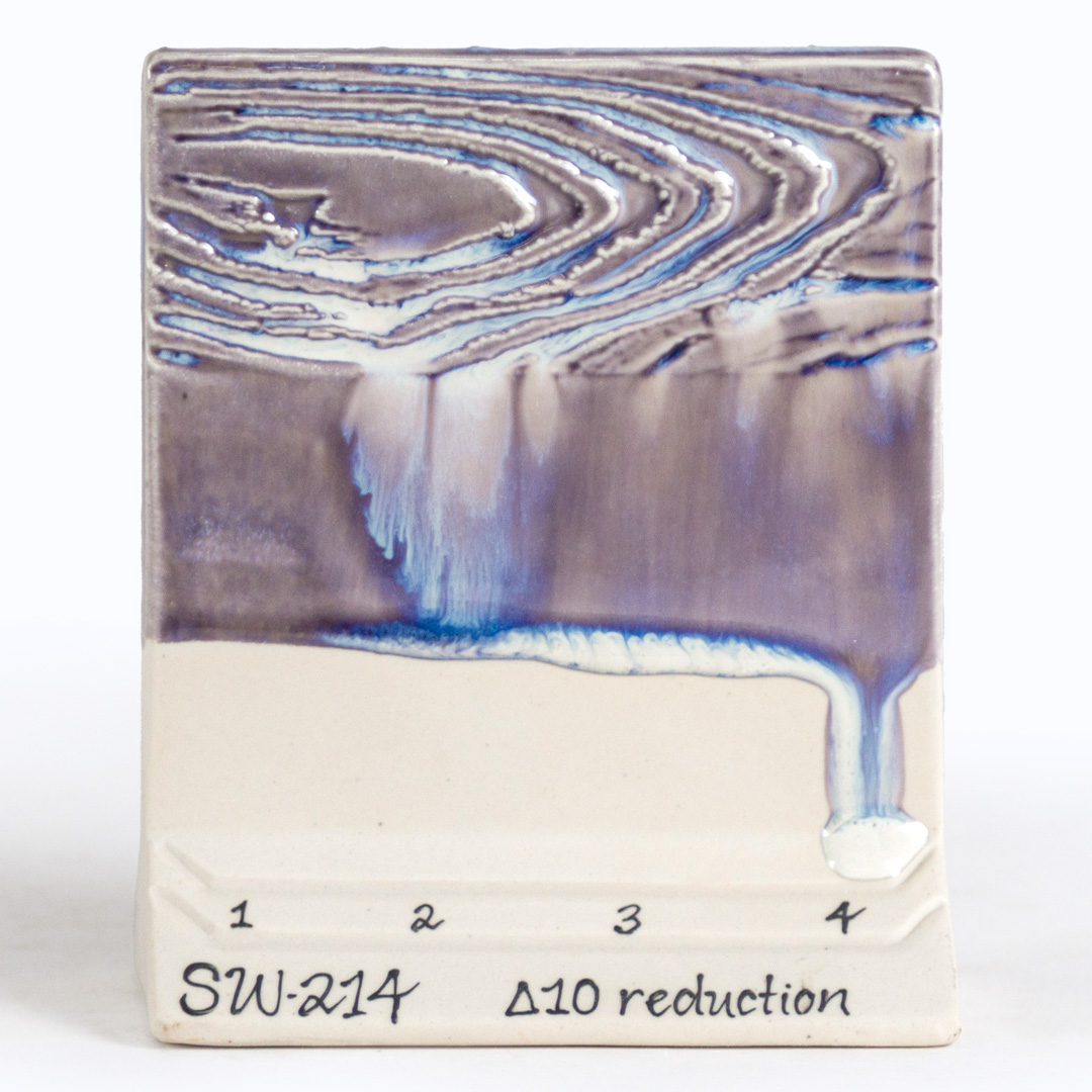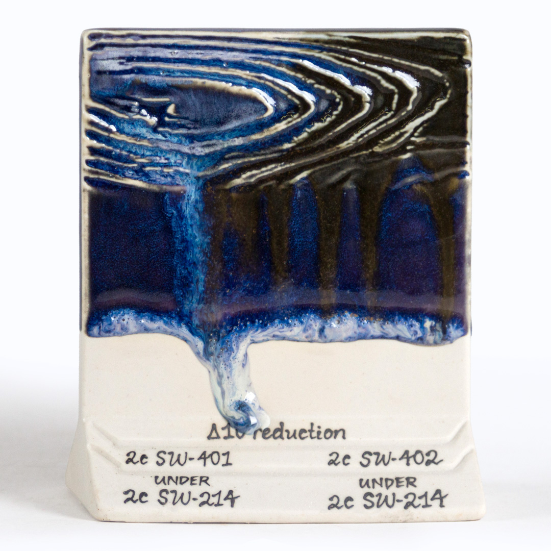 Kegel 10 Reduktion (1280°C): Die Glasur dunkelt zu Blau, Lila und Weiß auf.