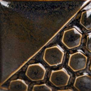 Kegel 6 Oxidation (1240 °C): Die Farbe wird zu einem opaken Braun/Gold, das über Struktur aufbricht und sich goldfarben sammelt. Erhöhte Fließfähigkeit. Oberflächenfehler möglich.