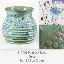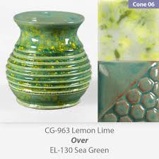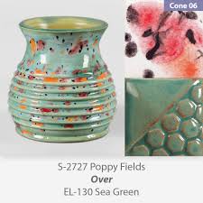 Kegel 06 (1000°C) Oxidation: Sea Green ist eine glänzende, blaugrüne Glasur, die bei drei Schichten in ein dunkleres Blaugrün übergeht. Sie enthält einen orangebraunen Farbton.