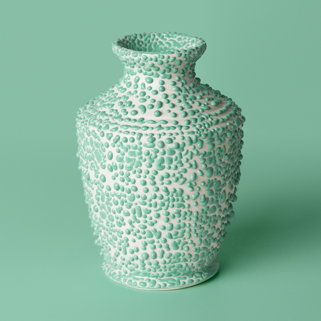 Brennen Sie bei der gewünschten Temperatur, Kegel 5-10 (1186 °C-1285 °C). Kegel 5–6 (1186 °C bis 1222 °C): Erzeugt eine erhabene Perlenstruktur mit unterschiedlichen Formen und Größen. Kegel 10 (1285 °C): Die Glasur wird weich und verteilt sich, was die Oberflächenstruktur verändern kann. Testen Sie immer mit Ihrer spezifischen Tonmasse. Die Ergebnisse können je nach Material und Brennkurve variieren.
