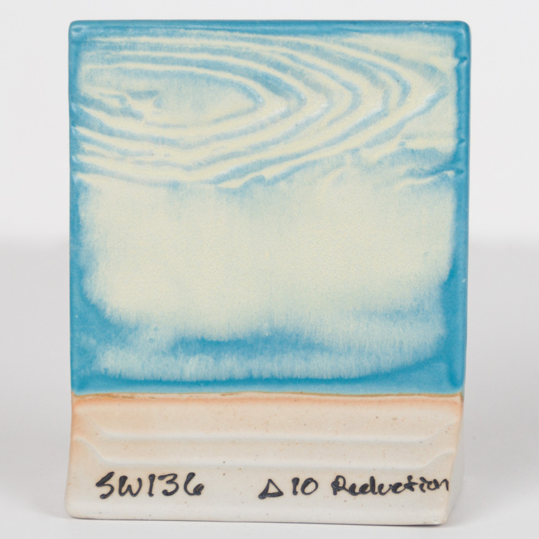 TIPP: Verdünnte Schichten erzeugen ein himmelblaues satinartiges Finish. Dickere Anwendungen erhöhen die weiße Variation. Der Pinselstrich ist im fertigen Ergebnis sichtbar. Wir empfehlen, Schichten auf Bisque in verschiedenen Richtungen aufzutragen (Kreuzhatch). Obwohl das Finish undurchsichtig erscheint, kann Oberflächendekoration leicht durch die Glasur gesehen werden.