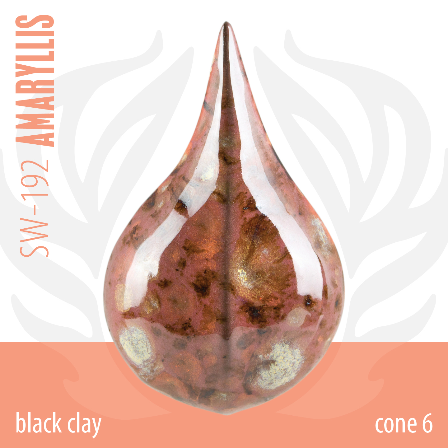 Cone 6 oxidation (1230°C): Amaryllis is a glossy, transparent coral glaze with crystals of varying sizes that bloom in shades of brown, yellow and orange.