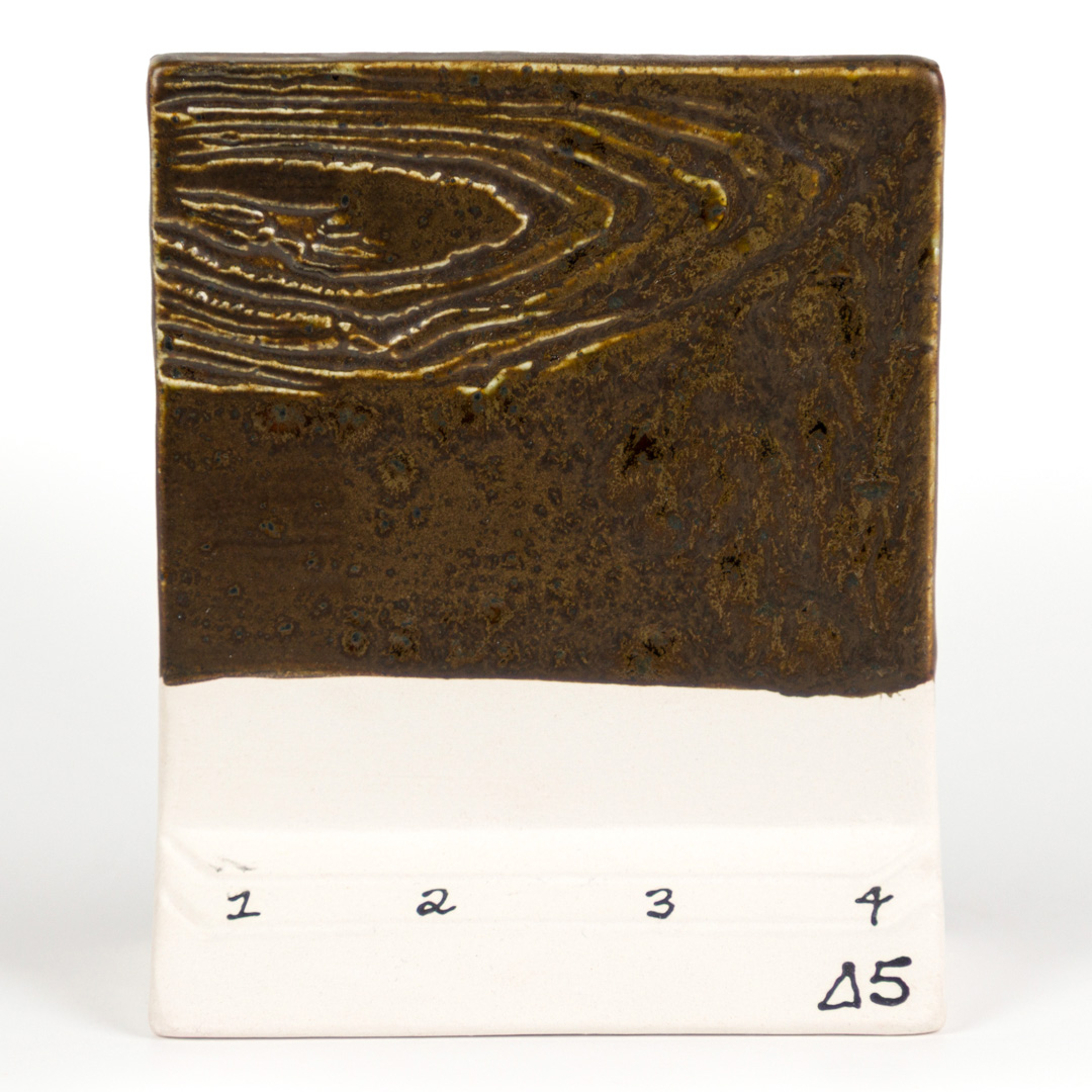 Cone 6 (1230°C): Black Timber is a satin, opaque, mottled brown glaze that breaks over texture. Contains glossy brown crystals. Base color is stable, crystals can create movement.