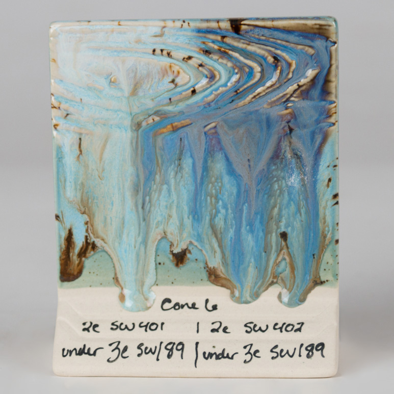 Stoneware Crystal glazes are designed to expand upon the surface with dazzling bursts of color. Fired results will vary based on ware’s orientation. Crystals will settle to the bottom of the jar and will need a good mixing prior to initial use. Re-stir between each coat. Stir with palette knife or other unpainted tool. Avoid placing crystals near the bottom third of a vertical piece as they may cause additional movement during firing. Crystals will flow more than the base glaze. While the glaze is wet, use your fan brush to redistribute the crystals to achieve balanced coverage. Over-application or heavy deposition of the crystals can cause pinholing or running. When storing a crystal glaze, you may consider storing upside down to facilitate crystal dispersion on the next use.Cone 6 oxidation (1230°C): Cenote is a semi-opaque, sky blue gloss glaze that has a variety of brown crystals that melt during firing.