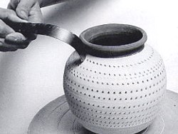 Chatter marking was first used in China around the twelfth century. In Japan it appears in Okinawa and Kyushu folk kilns from the eighteenth century. It is made by applying a springy metal tool to the surface of a slipped pot. The tool bounces and creates a rhythmic pattern of nicks in the slip, exposing the contrasting clay underneath. As the pot revolves on the wheel, the blade is applied to the slipped surface. It takes some testing and experience to determine the correct state of dryness, the correct speed of the wheel, and the desired chatter pattern. If the slip coat is too wet, the blade won't skip. If too dry, the surface becomes impenetrable. 21,6 cm.