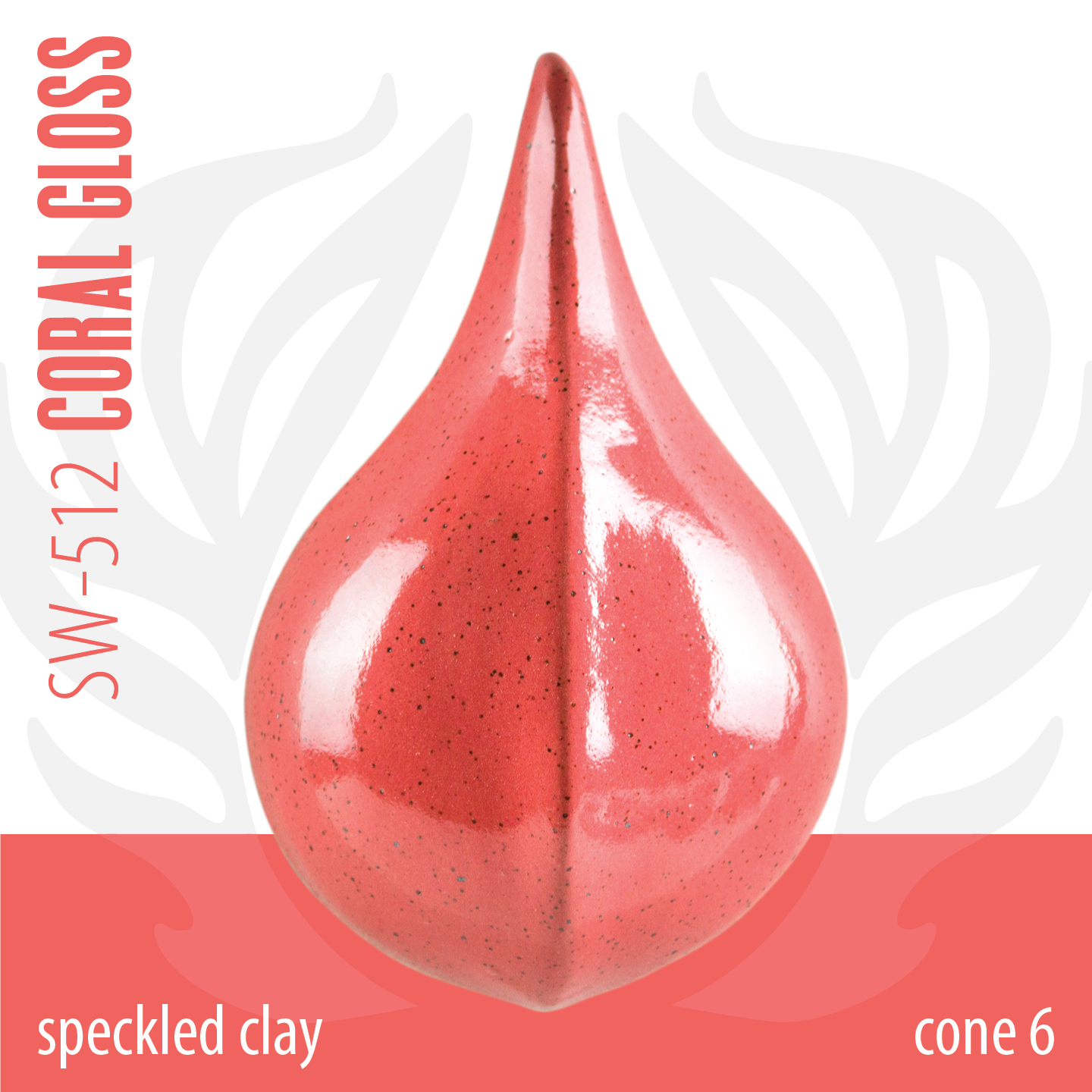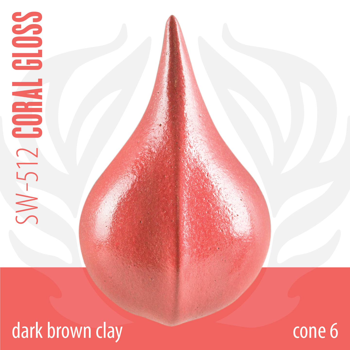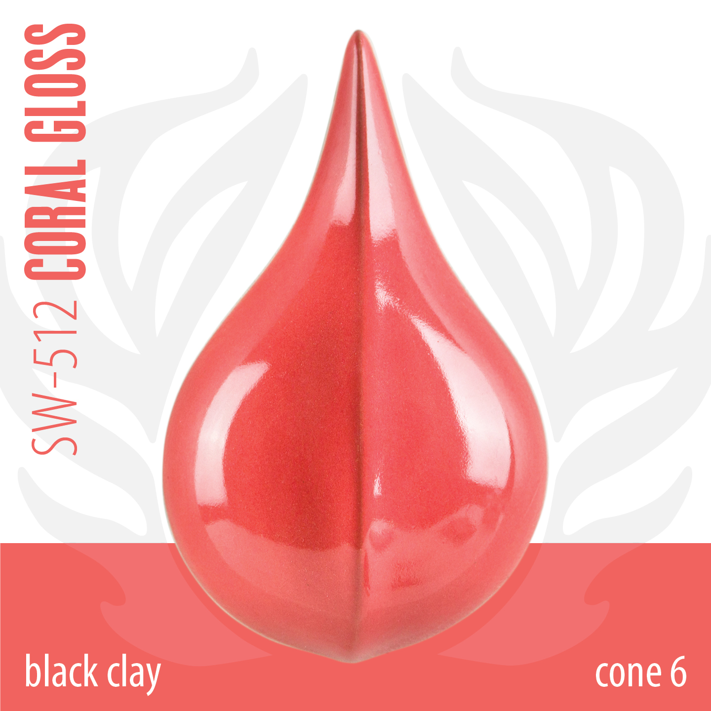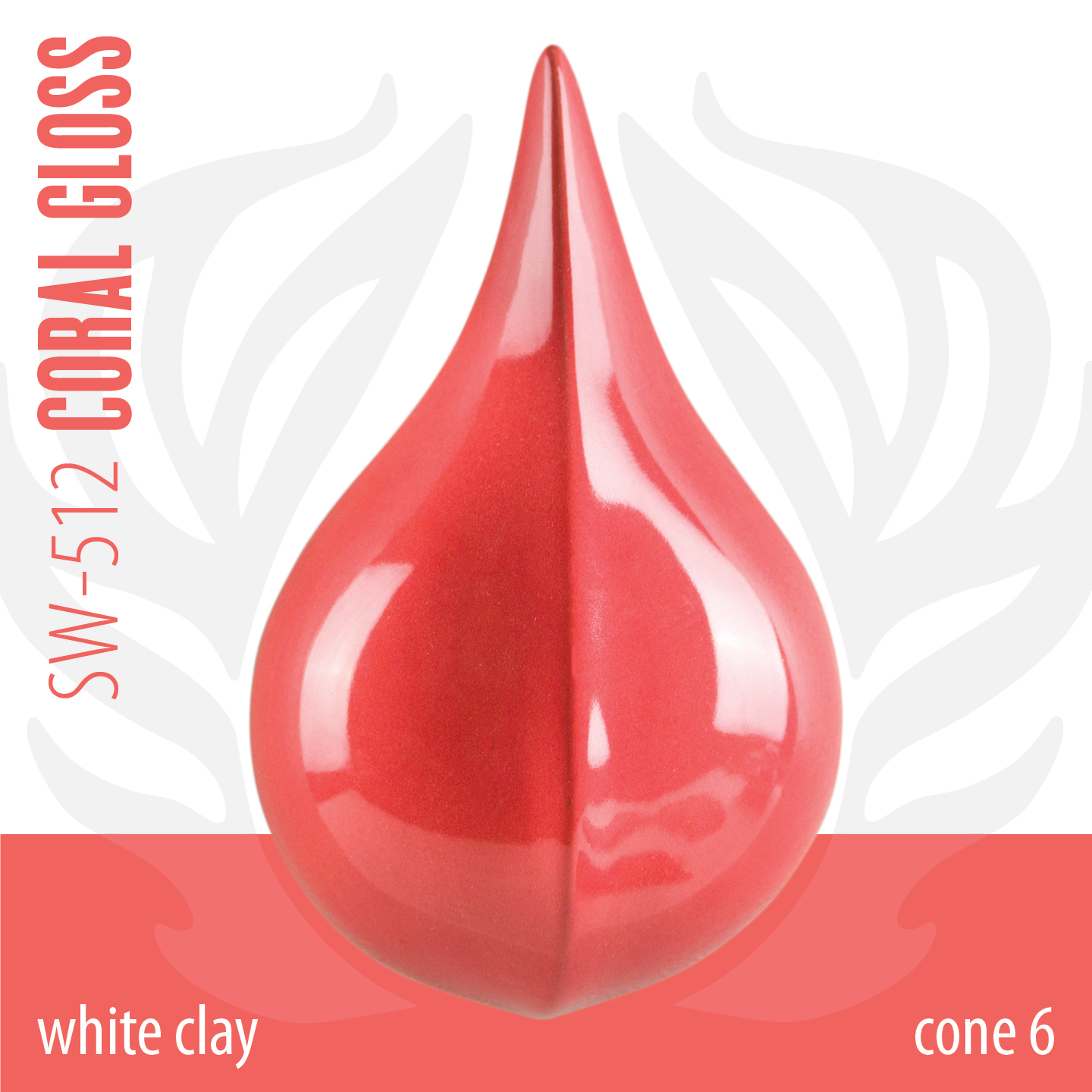 Cone 6 oxidation (1230°C): Coral Gloss is a glossy, opaque, vibrant coral glaze that is highly pigmented and formulated for stable design work at midrange temperatures and above.