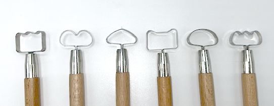 This is a set of 6 assorted handle tools. Drawn these handle tools through a slab of clay, they will form perfectly shaped strips that can be readily cut to a length and attached to a ceramic vessel. The stainless steel ribbon is firmly set in a smooth hardwood handle. 2,2 x 1 - 1,5 cm. 6 pcs.