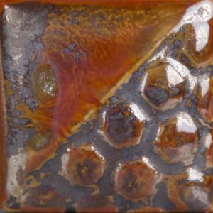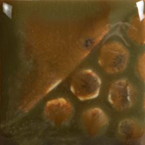 Cone 6 oxidation (1240 °C): Base glaze changes to a variegated olive/red and breaks over texture; crystals fade. Enhanced mobility. Surface issues may occur.