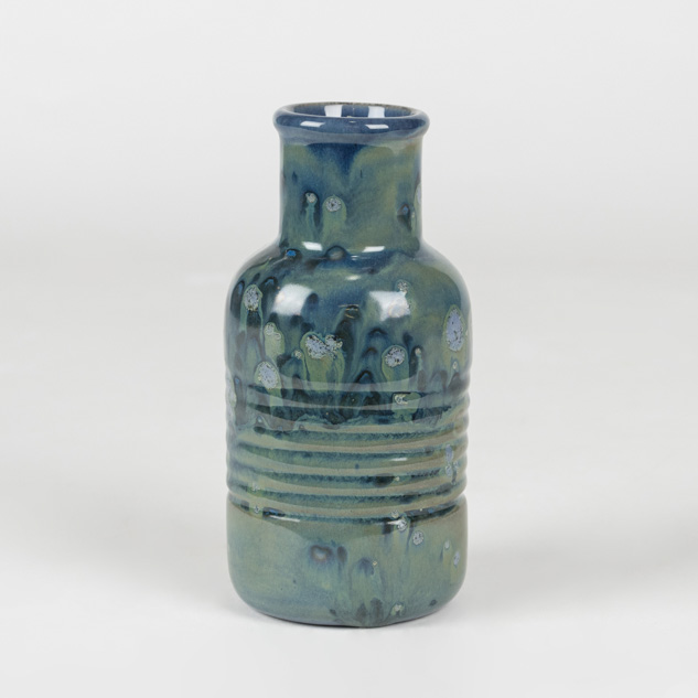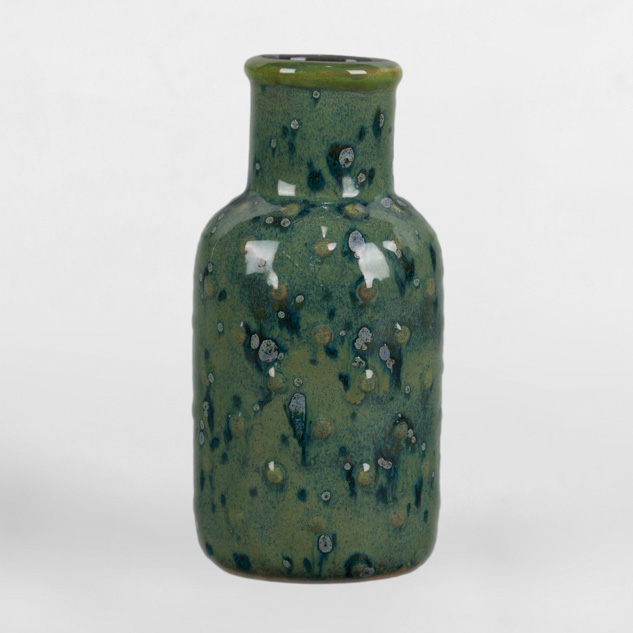 Cone 06 oxidation (1000 °C): Moss Creek is a matte, olive green glaze that breaks to a dark blueish green. It has an orangish brown stain and large light and dark blue crystals.