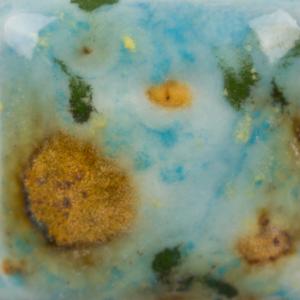 Cone 06 oxidation (1000°C): Mountain Moss is an opaque gray base glaze with larger, variegated sage/brown crystals and smaller green and yellow crystals.