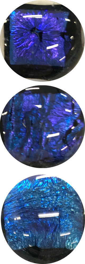 Each piece of glass is 5×5 cm, 3 mm thick and the set consists of three specially chosen colors. Dichroic effects on black base. Dichroic glass obtains the best quality if clear glass is used for the firing, especially concerning the red metal oxides. Fused in kiln or HotPot (micro kiln attachment), see kilns. Art4Fun glass is made from COE-90.