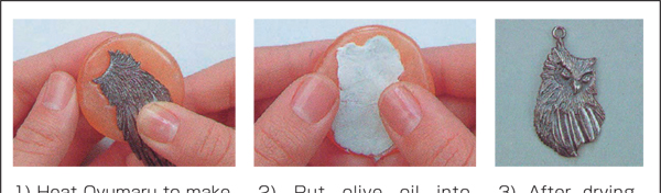 Oyumaru is a japanese reusable putty, which gets soft when put in hot water 80°C for a few minutes. Press the putty on the object one wants to copy as long as it is soft and let it cool of (takes just minutes) It can now be used to shape precious clay in the putty mold.