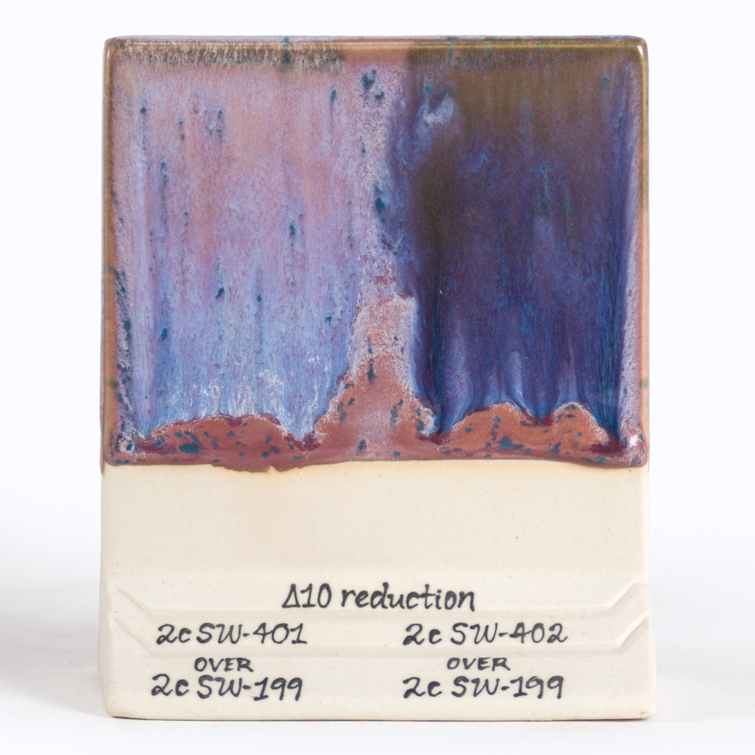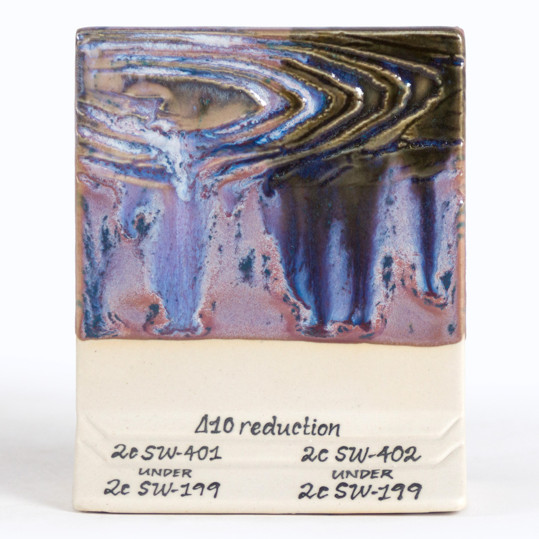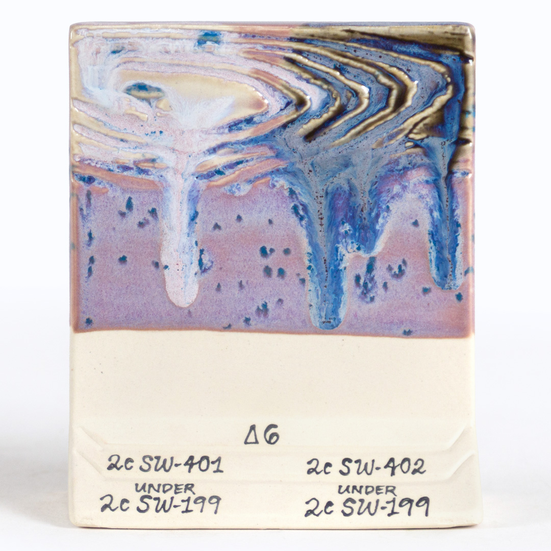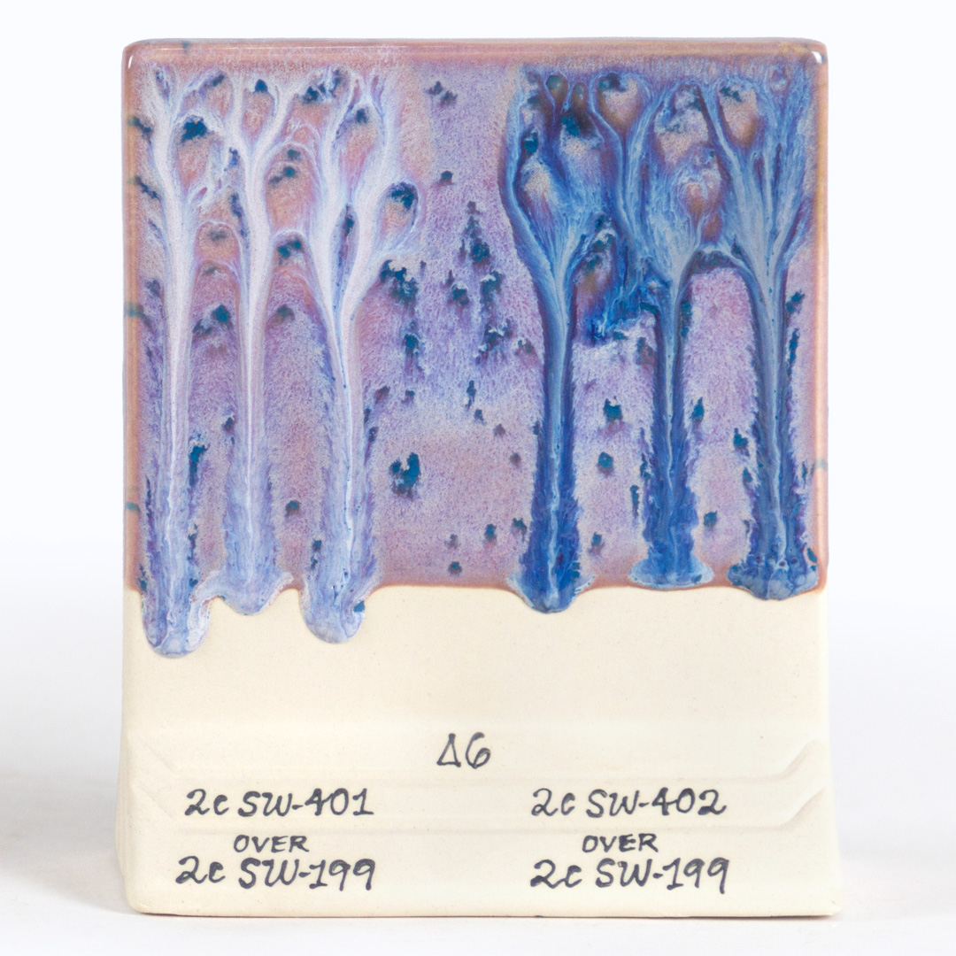 TIP: Purple Aster uses SW165 Lavender Mist as the base glaze. This glaze stable at 3 coats, even with heavy application. Crystals can create movement. Avoid having a heavy concentration of crystals near the bottom of your piece. Can be used in oxidation or reduction firings. Results may vary. The choice of clay body, thickness of application, firing process, and temperature will greatly affect the fired results. Always test your application on your clay body in your kiln environment.