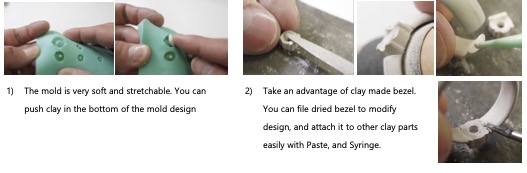 Approx. 0,5g-1g is needed for each mold. Set a fireable CZ stone in the molded bezel and fire together. The stone sets in the bezel by clay shrinkage as if it’s been set in tube o prong bezel. 65 x 88 mm.