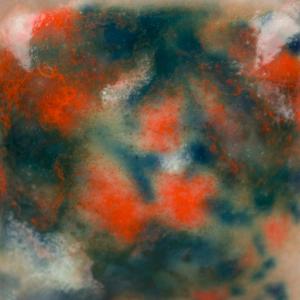 Cone 06 oxidation (1000°C): Smoke & Fire is a translucent gray base glaze with white and orange crystals that melt/bloom and cobalt blue specks.