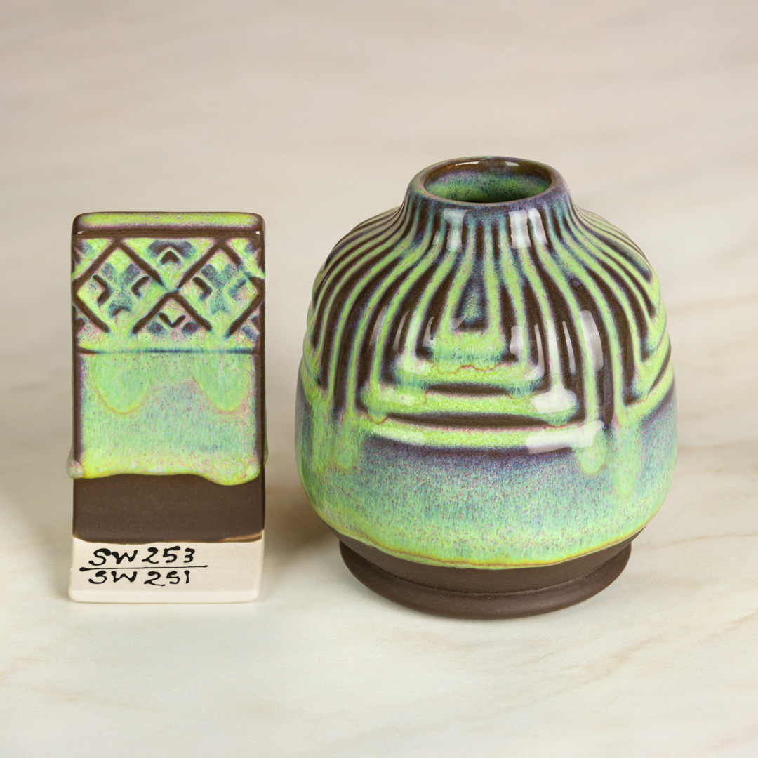 On the shown pictures a combination of EG004 (dark brown engobe), SW-251 (pink opal) and SW-253 (green opal) were used.