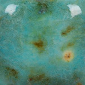 Kägla 06 oxidation (1000°C): Blue Guppy är en semitransparent turkos basglasyr med svarta och olivfärgade metalliska kristaller med skiftande nyanser.