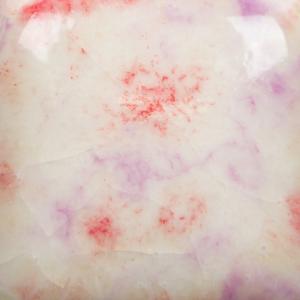 Kägla 06 oxidation (1000°C): Barry Tart är en semitransparent rosa basglasyr med röda, lila och vita kristaller.