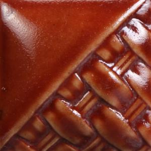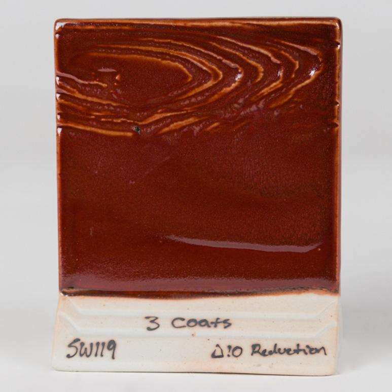 Kägla 6 oxidation (1230°C): Cinnabar är en rik rödbrun glansig glasyr som tenderar att få en grumligt lila yta vid kraftigare applicering.