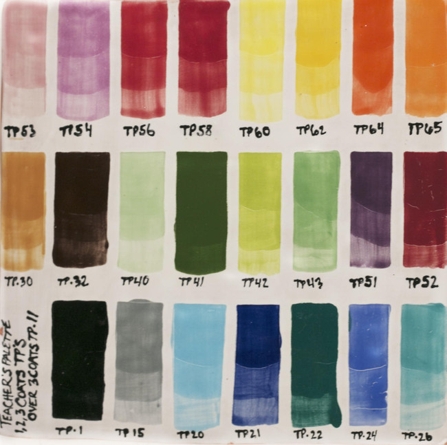 Amaco Teachers Palette är en opak glasyr som blir underbart smidig och blank efter bränningen. Den är 100% blandingsbar och färgstark. Burken skakas ordentligt innan användningen och sedan appliceras 3 lager med pensel om inget annat sägs på förpackningen. Bränns till ca 1044°C med en medellångsam brännkurva.