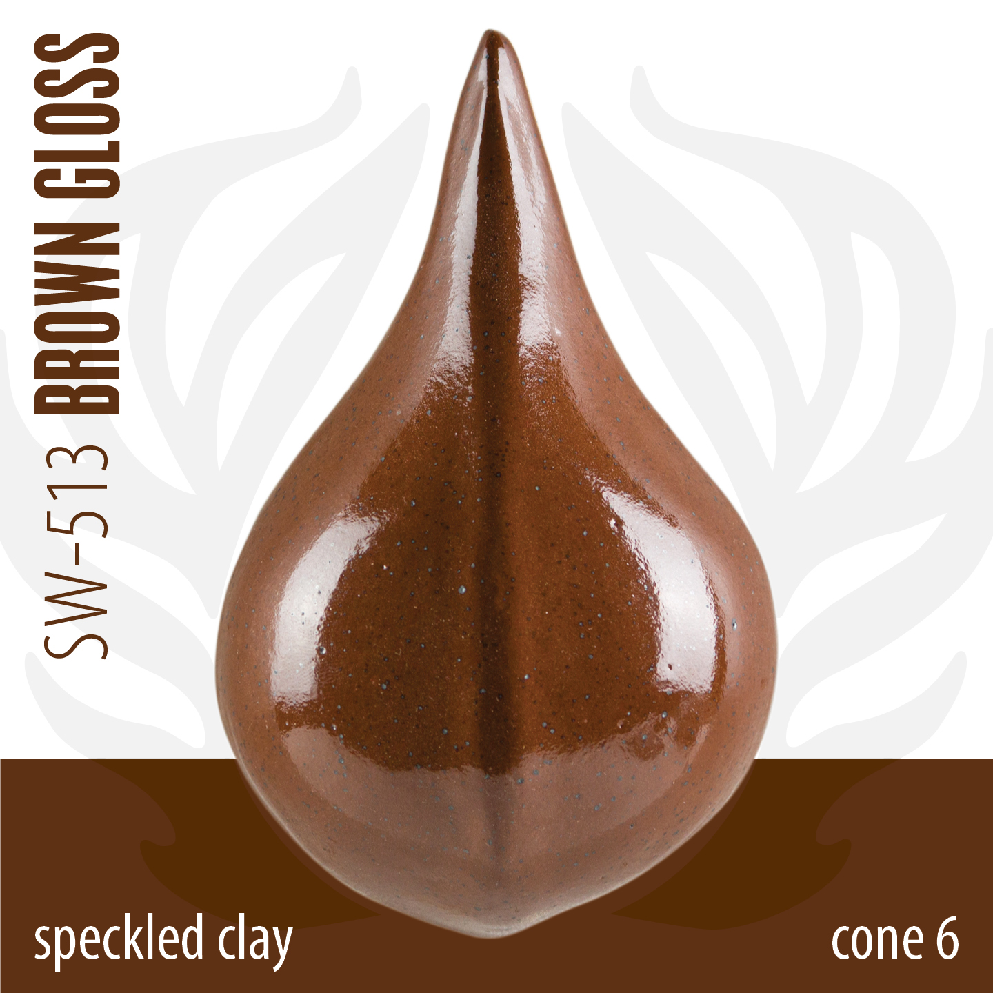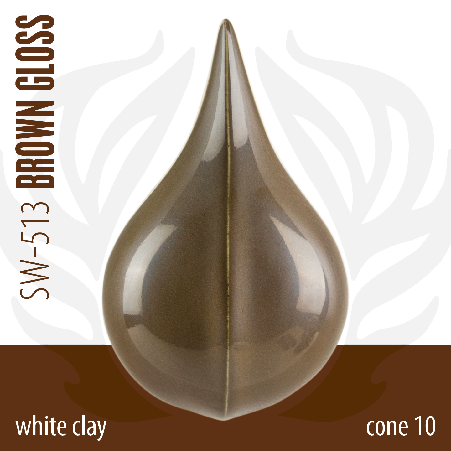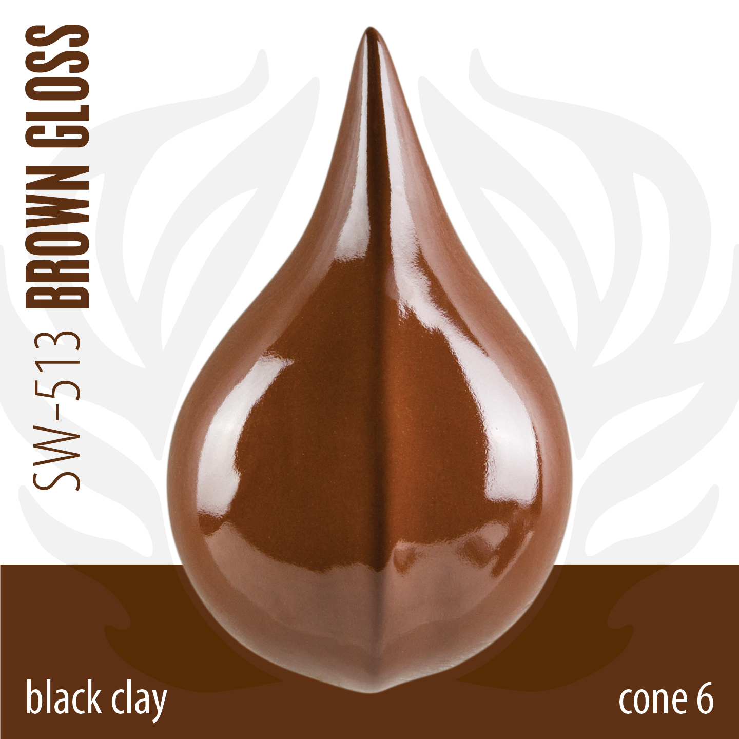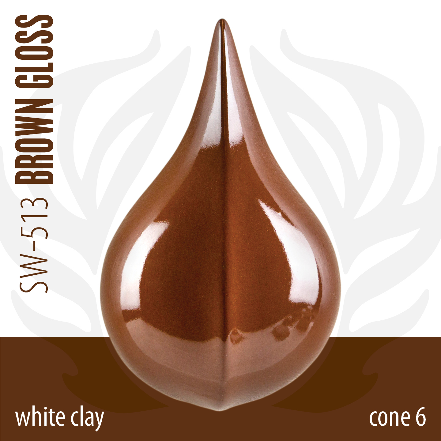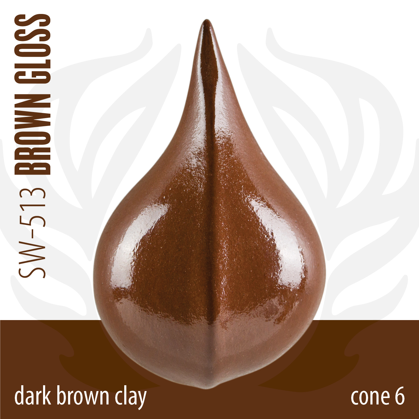 Kägla 6 oxidation (1230°C: Brun glans är en glansig, opak, rik brun glasyr som är högpigmenterad och formulerad för stabilt designarbete vid medeltemperaturer och högre.