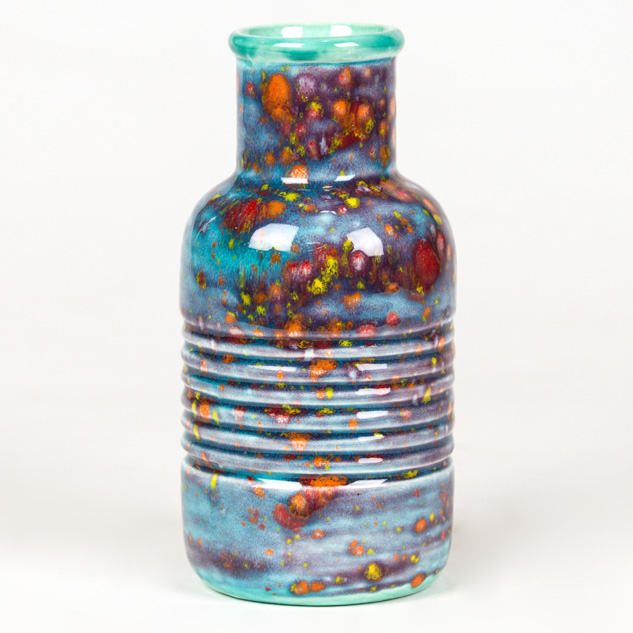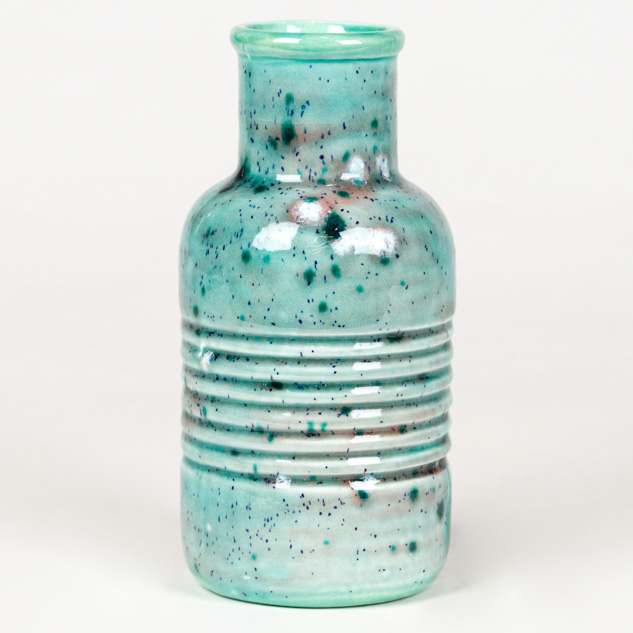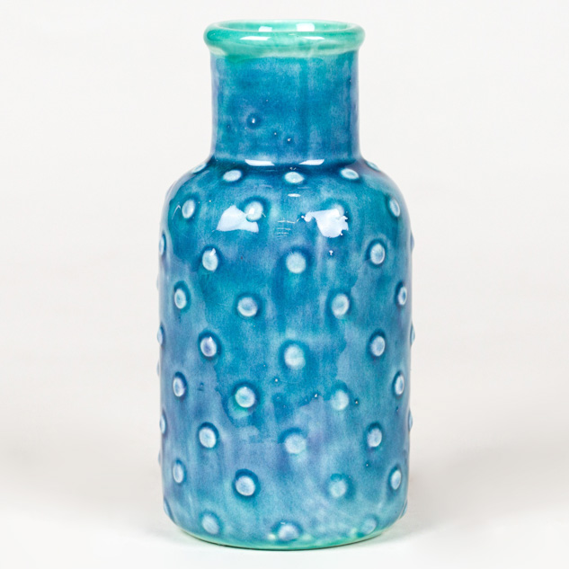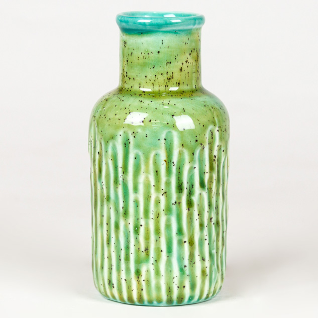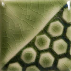 Kägla 6 oxidation (1240 °C): Färgen förändras till en transparent grön som bryter över struktur och samlas i fördjupningar. Ökad rörlighet. Ytproblem kan förekomma.