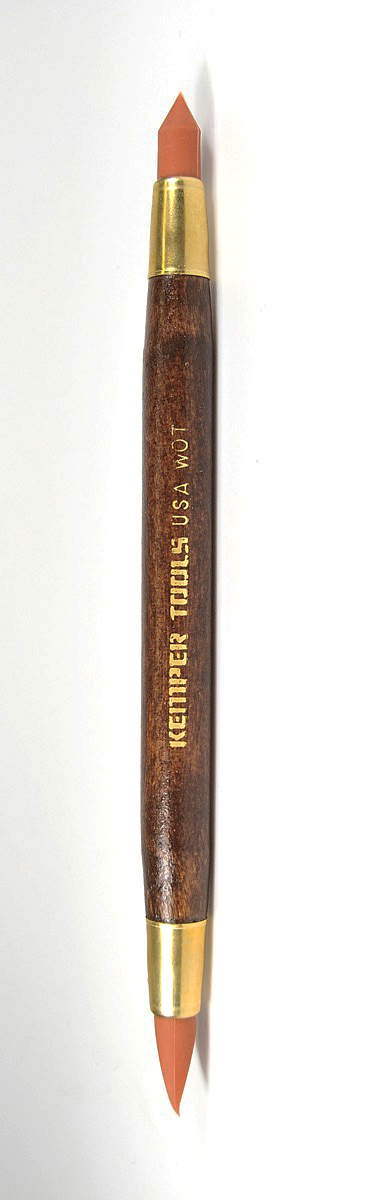 Ett tåligt rengöringsverktyg av hög kvalitet från Kemper för lätt ta bort missatag av färg, glasyr och dylikt på hala ytor. Fungerar även bra för att göra mjuka dekorationer i lera. Verktyget och greppet är av hårt trä med två gummihuvuden i olika utformningar.