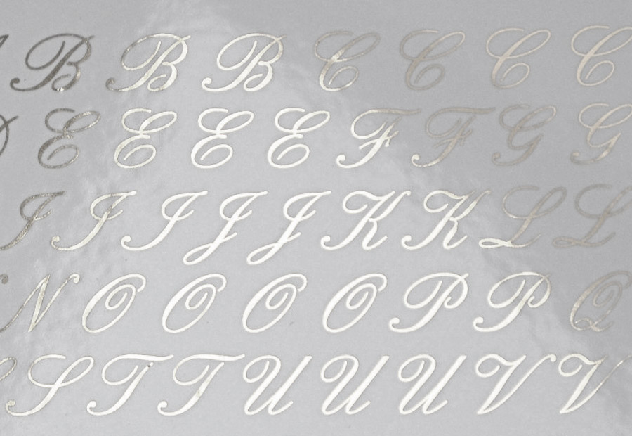 Dekaler av äkta metall som appliceras på det glaserade godset eller glas för att sedan brännas fast (se brännkurva nedan). Arken på 10 x 13 cm innehåller ett alfabet som är ca 1 cm stora. Brännkurva och bruksanvisning nedan.
