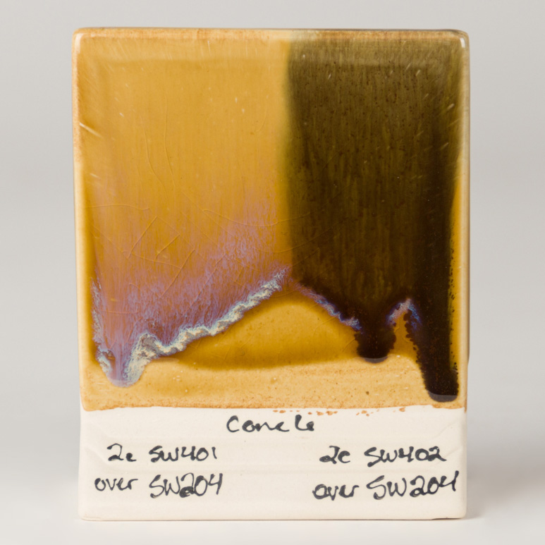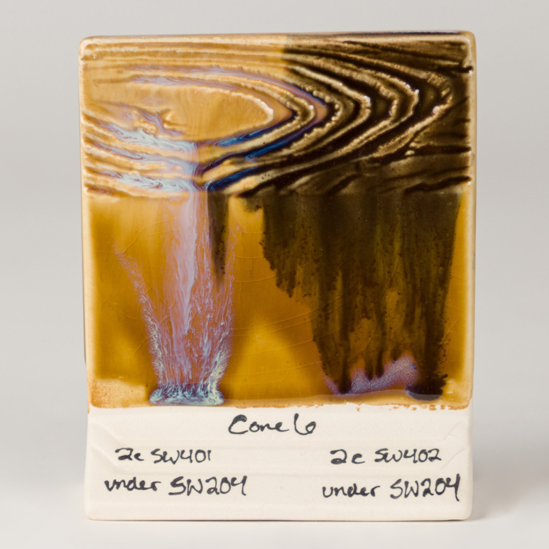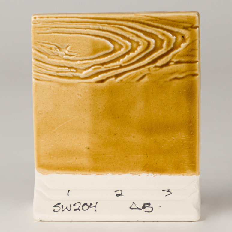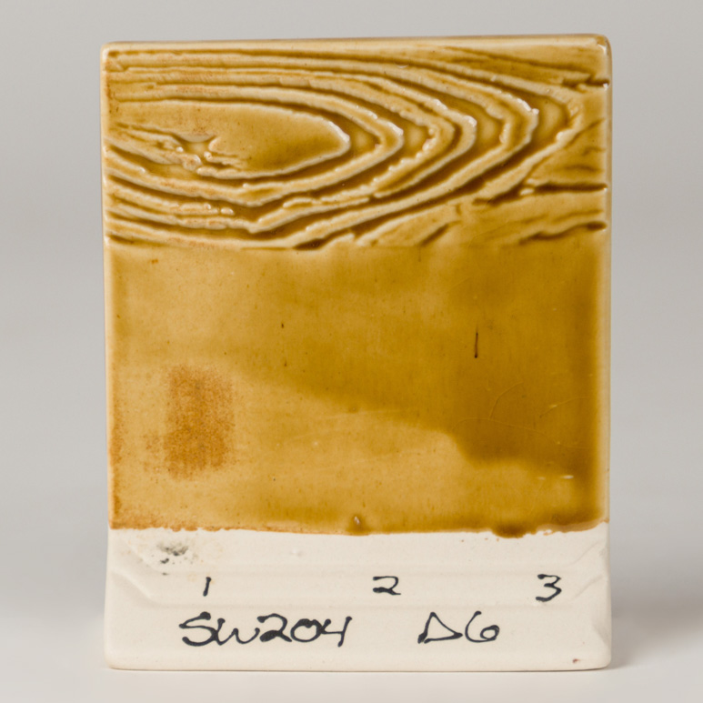 Kägla 6 oxidation (1230°C): Amber Topaz ger en transparent, ljus honungsblond färg. Designad för att ge en antydan av färg med ett lager, djupare färg med två till tre lager – men förblir transparent.