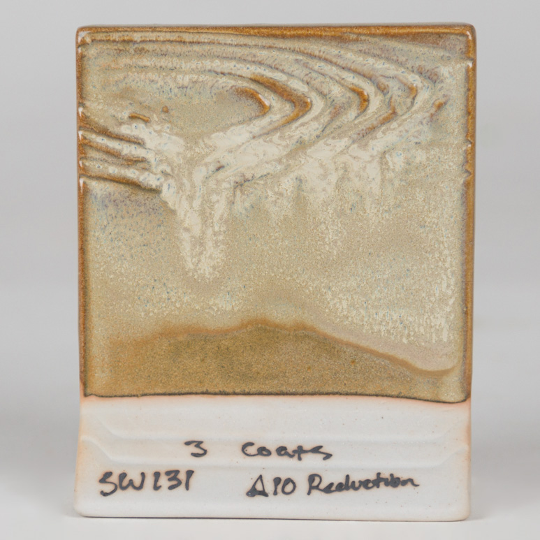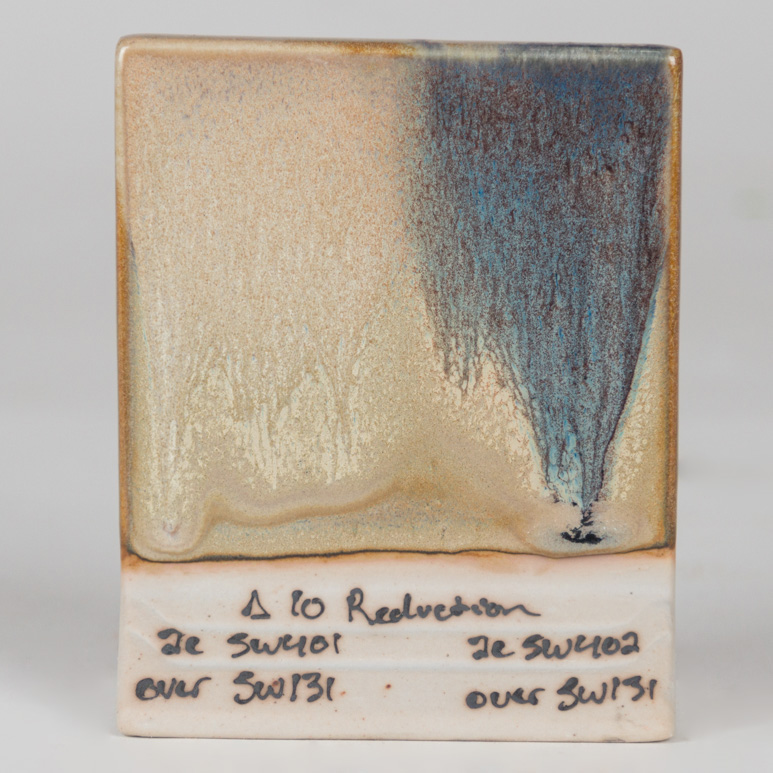 Kägla 10 reduktion (1280°C): Krämfärgen kvarstår och bruna undertoner blir mörkare.