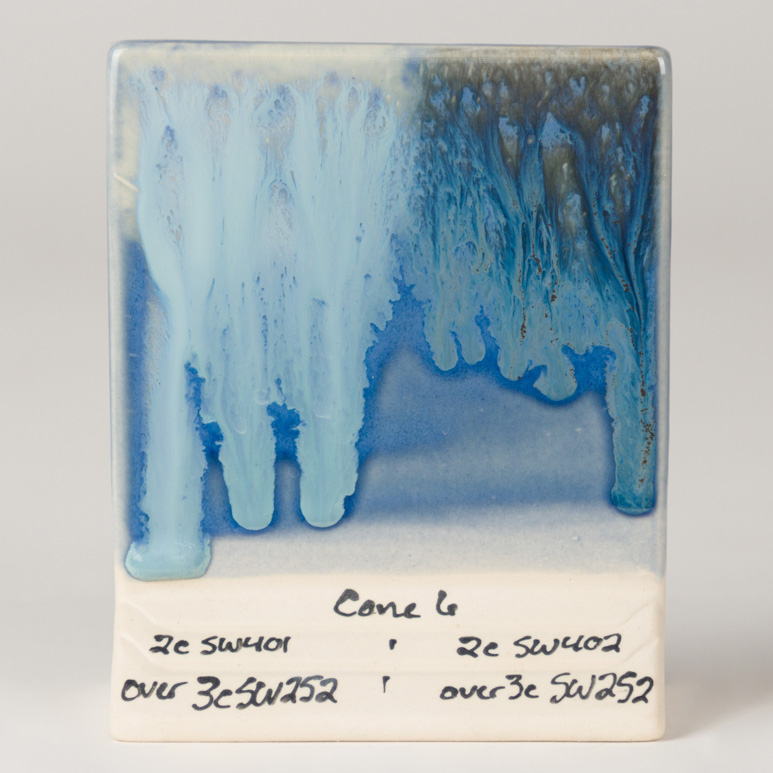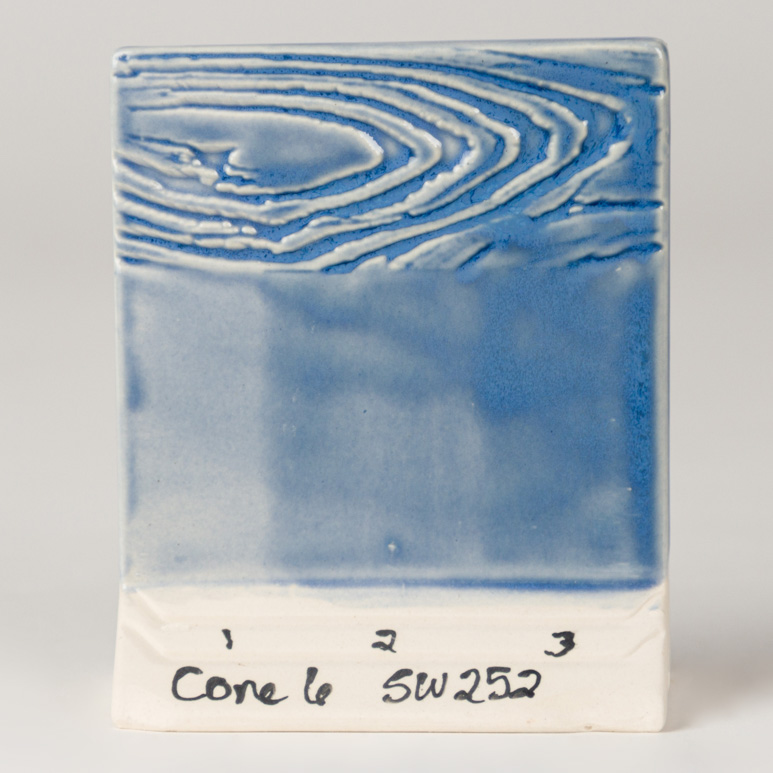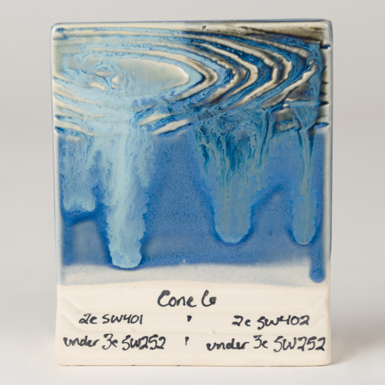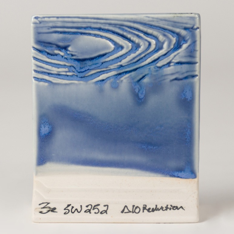 Kägla 6 oxidation (1230°C): Blå Opal är en medelblå halvt genomskinlig till helt ogenomskinlig glansglasyr. Tunnare appliceringar skapar en genomskinlig blå dimma; tjockare lager ger en ogenomskinlig yta. Ytstrukturer kan orsaka att glasyren samlas och skapar strimmor av gråblått.