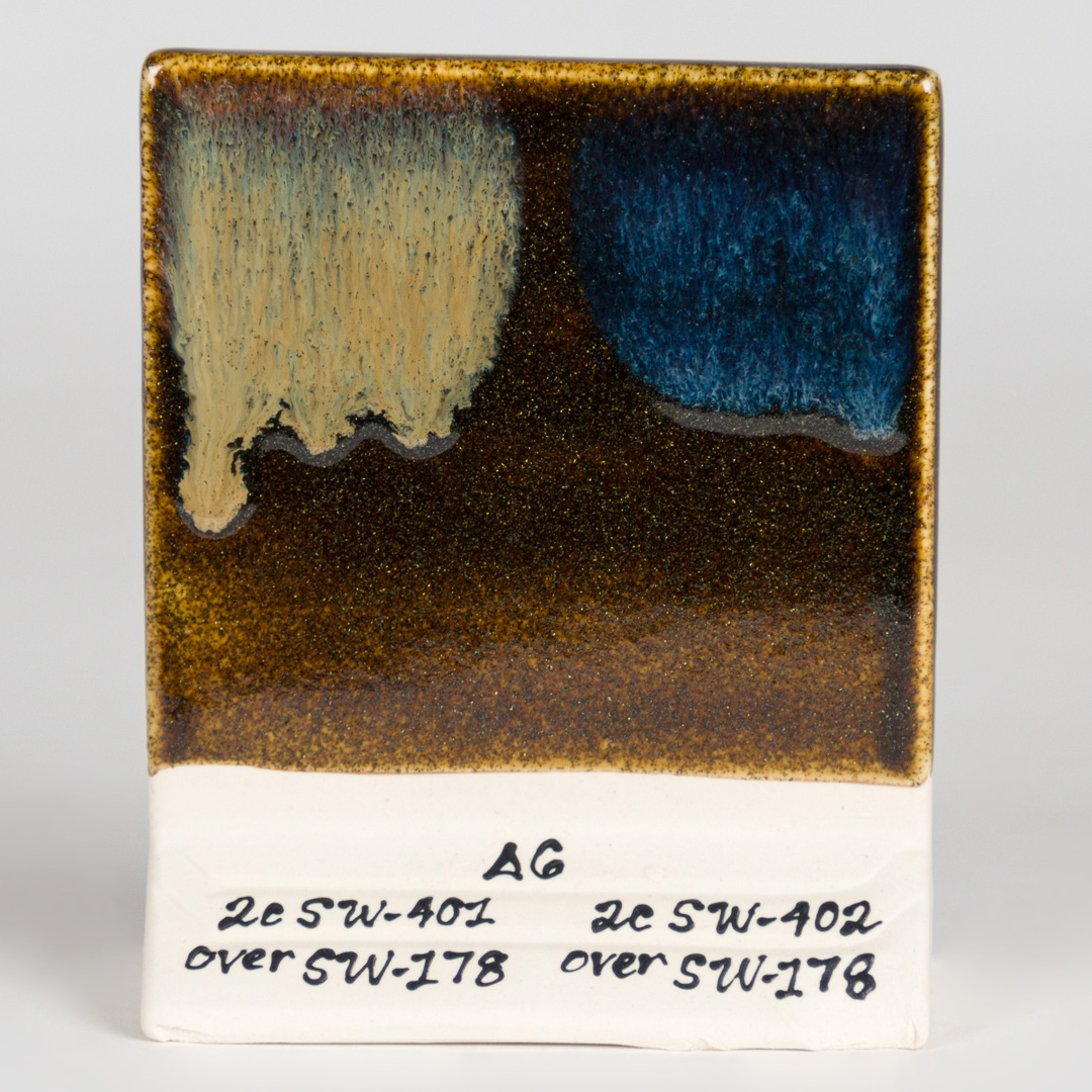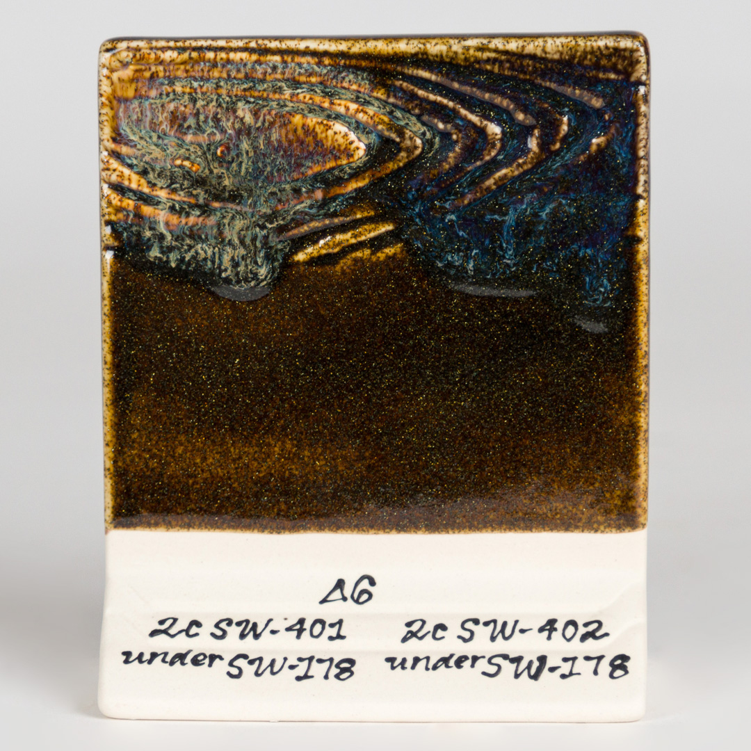 Kägla 6 oxidering (1230°C): Fool’s Gold är en glansig, semi-transparent glasyr bestående av en rik brun bas med små, guldmetalliska fläckar. Variationerna i glasyren beror på appliceringen. Ju tjockare applicering, desto mer homogen blir färgen. Glasyren blir genomskinlig och samlas mörkare runt ytan med textur.