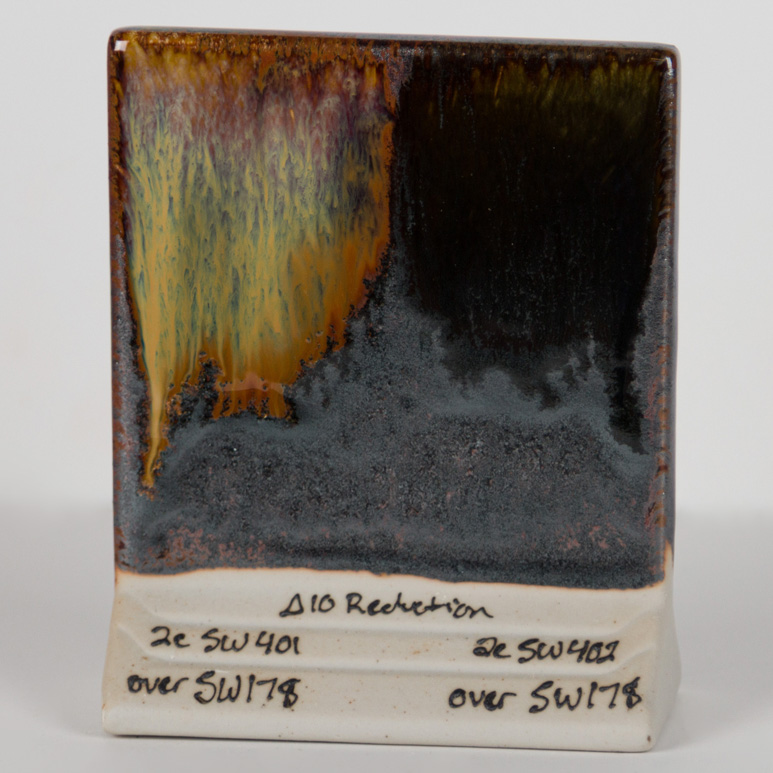 Kägla 10 reduktion (1280°C): Färgen mörknar och producerar metallisk flammighet.