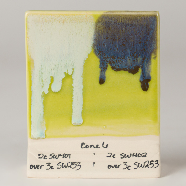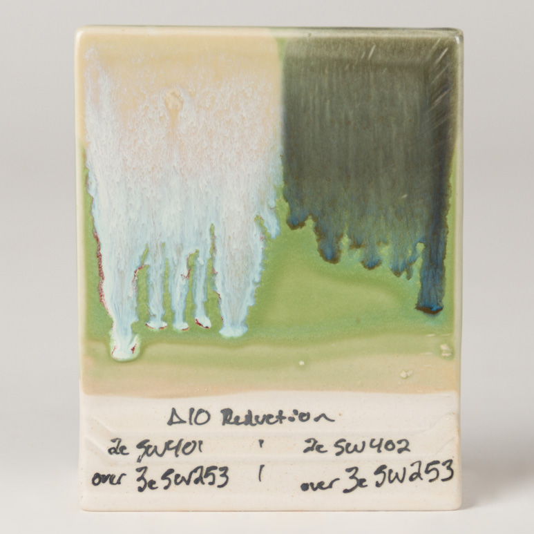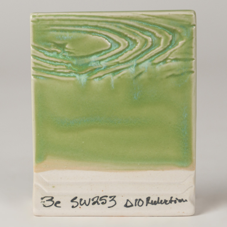 TIPS: Mörkare lerkroppar, som buff och brun, visar de fosforescerande egenskaperna hos Grön Opal. På mangankroppar kommer Grön Opal att interagera med mangankroppar och skapa intressanta bruna strimmor. Tunnare applicering ger en glansig genomskinlig yta. Tjockare applicering ger en ljusgrön flytande effekt. Ytdekoration kommer att vara synlig under glasyren, men om du applicerar glasyren tjockt kan den sudda ut din bild.
