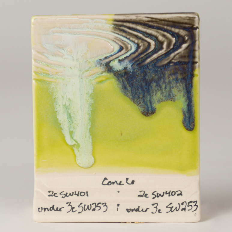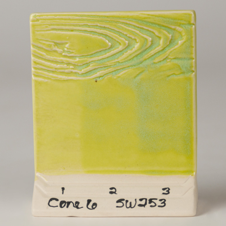 Kägla 6 oxidation (1230°C): Grön Opal uppnår en livfull chartreuse-glans när den bränns. Lättare appliceringar leder till en halvt ogenomskinlig gulgrön; tyngre appliceringar ser bildandet av en grön flytande effekt.