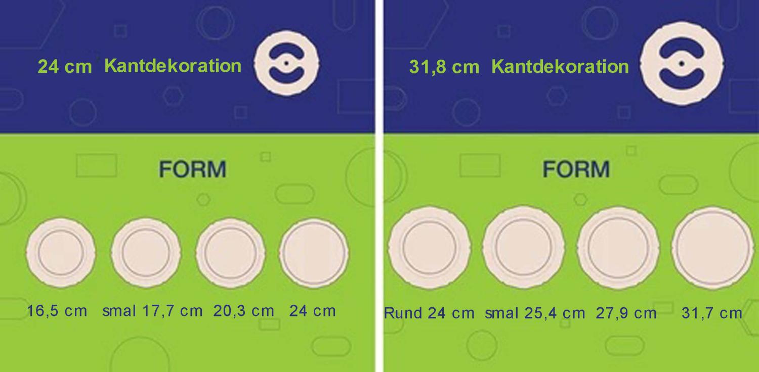 Skivorna i MDF (0,5 cm) används för att lägga kavlad lera på de och på det sättet forma jämna bruksföremål. Dessa dekorationer kommer enstaka eller som set med två (27 och 35 cm) och används som en schablon för att skapa dekorerativa kanter på tallrikar. Man kan använda alla runda formar med kantdekorationerna så länge formen inte är större än kantdekorationen.