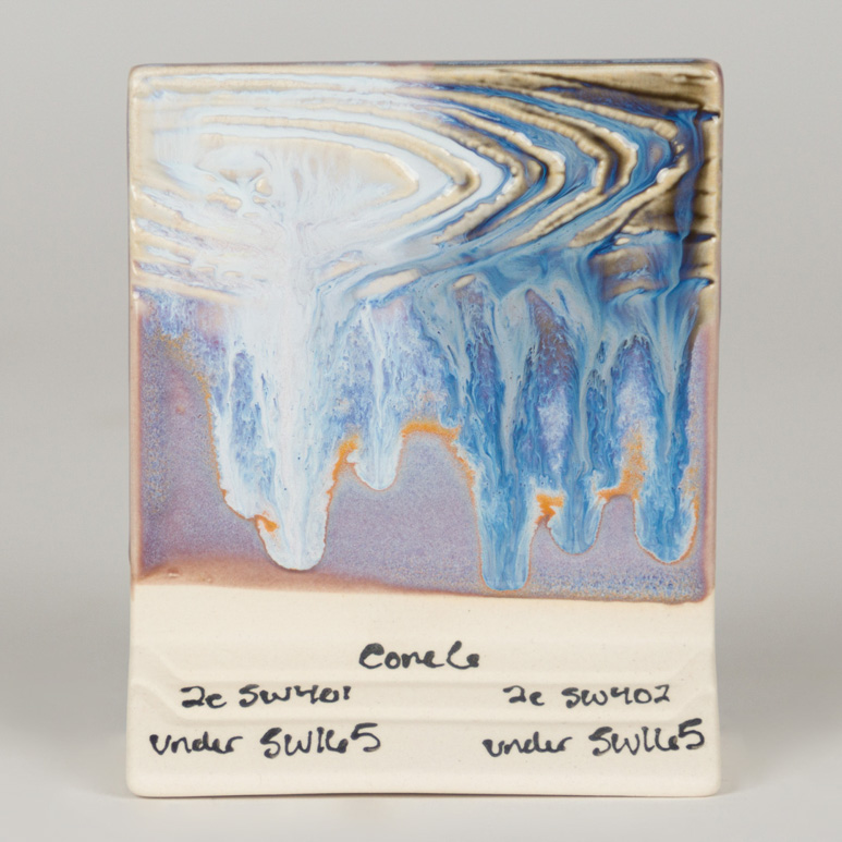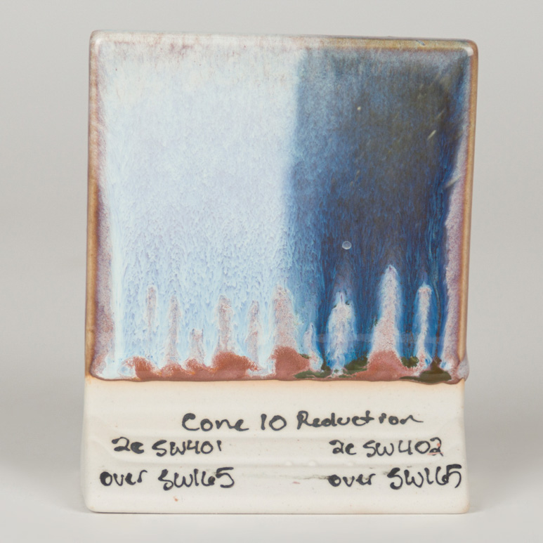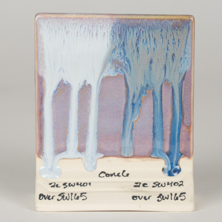 Kägla 6 Oxidation (1230°C): Lavender Mist är en semi-opak glansig glasyr som visar nyanser av lavendel och brunt. Glasyrens variation beror på appliceringen; Tjockare applicering ger en mer opak och homogen färg.