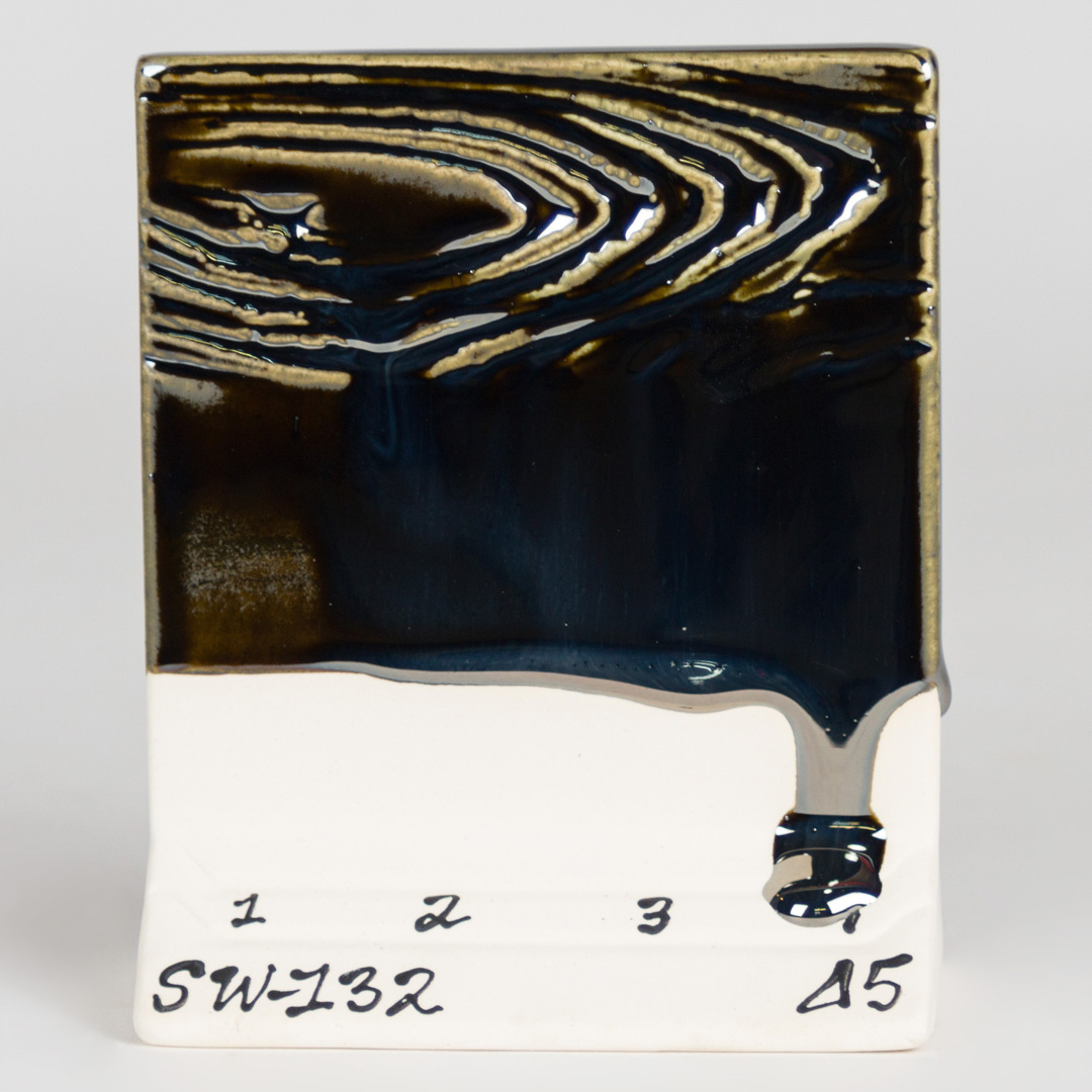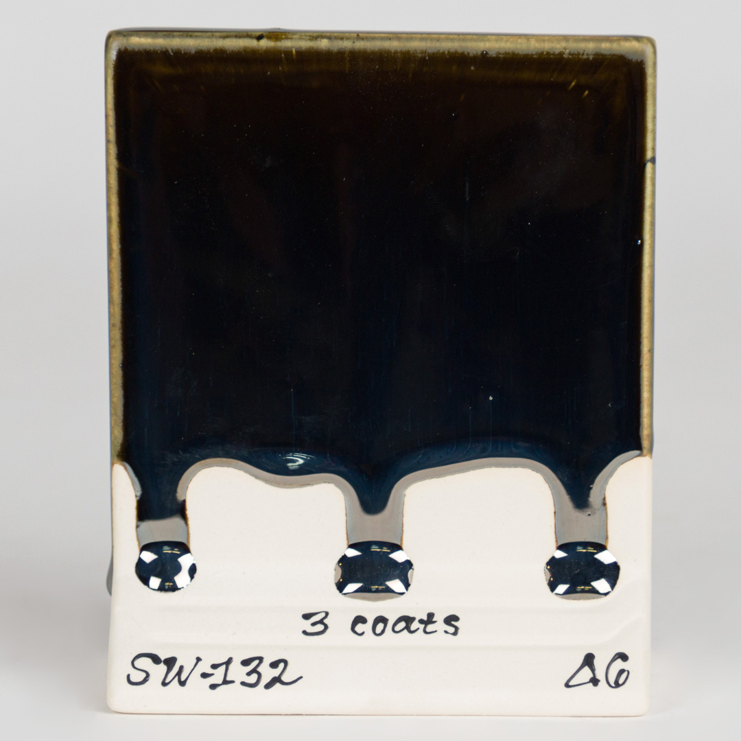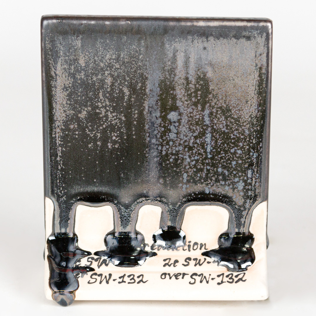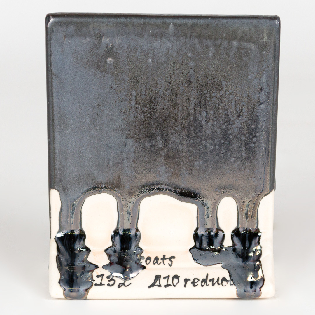 Kägla 6 oxidation (1230°C): Mirror Black skapar en högreflekterande, metallisk svart glansig yta. På vissa vertikala ytor och runt ytstrukturer kan mindre matta effekter ses; alla andra appliceringar resulterar i bildandet av en svart, metallisk spegel.