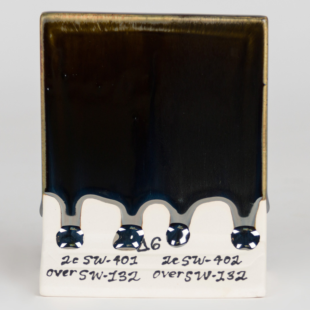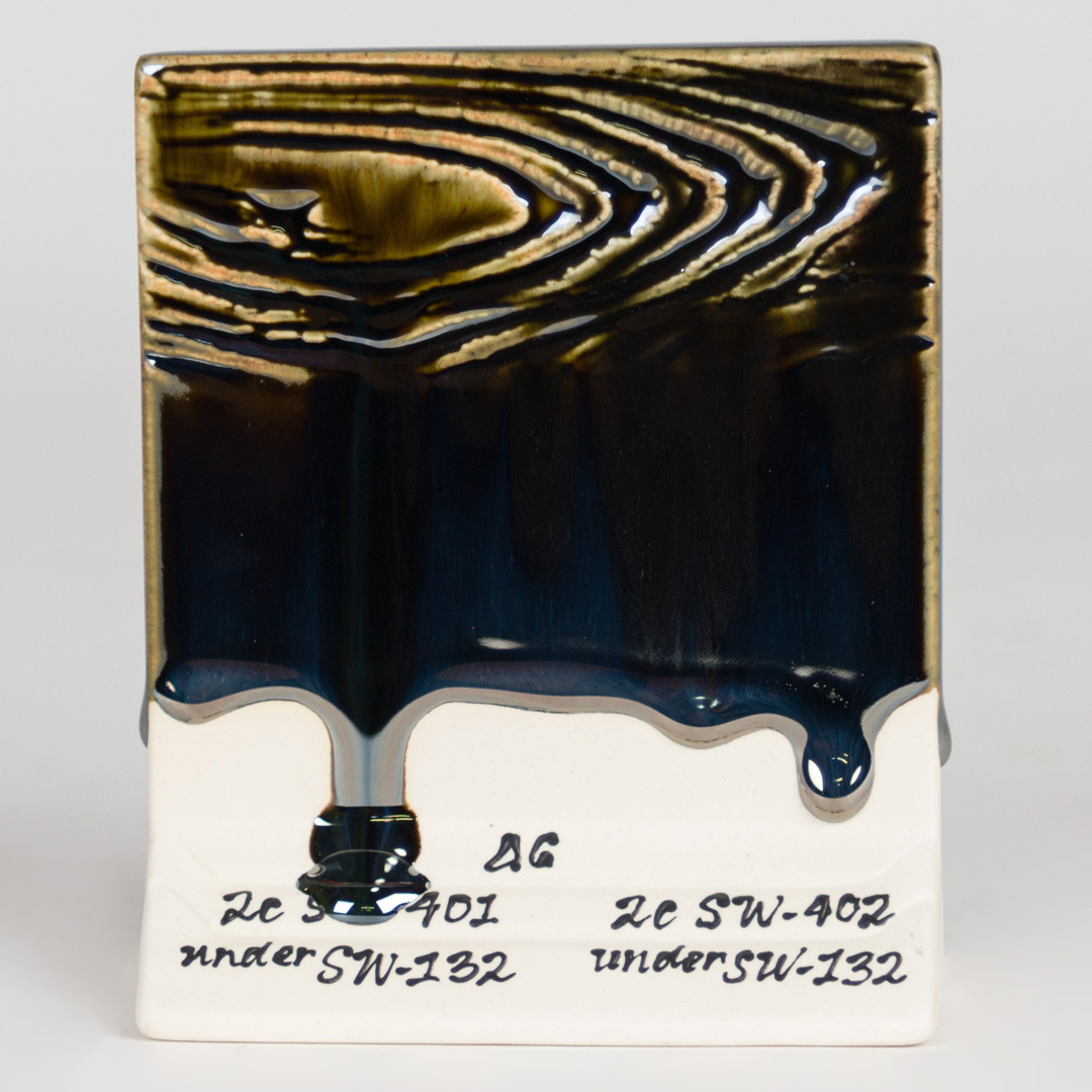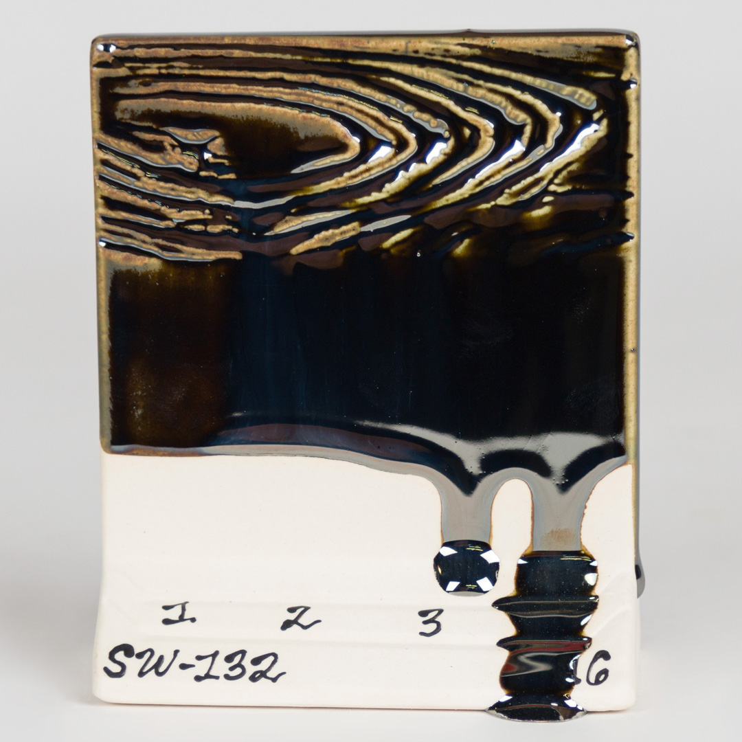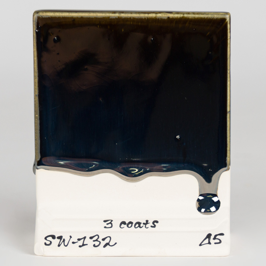 Kägla 6 oxidation (1230°C): Mirror Black skapar en högreflekterande, metallisk svart glansig yta. På vissa vertikala ytor och runt ytstrukturer kan mindre matta effekter ses; alla andra appliceringar resulterar i bildandet av en svart, metallisk spegel.