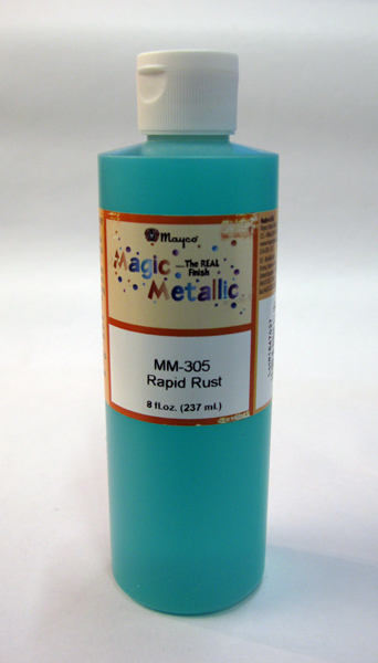 Magic Metallics™ Patina och Rapid Rust verkar oxiderande på Magic Metallic metallakryl. Koppar, guld och mörk brons får ett patinerad grönt/ brunt utseende när de behandlas med MM-202 Green Patina. Stål kommer att rosta när det behandlas med MM-305 Rapid Rust. Oxideringsmedlen (Patina och Rapid Rust) används som katalysator för att påskynda den naturliga processen.