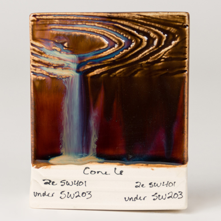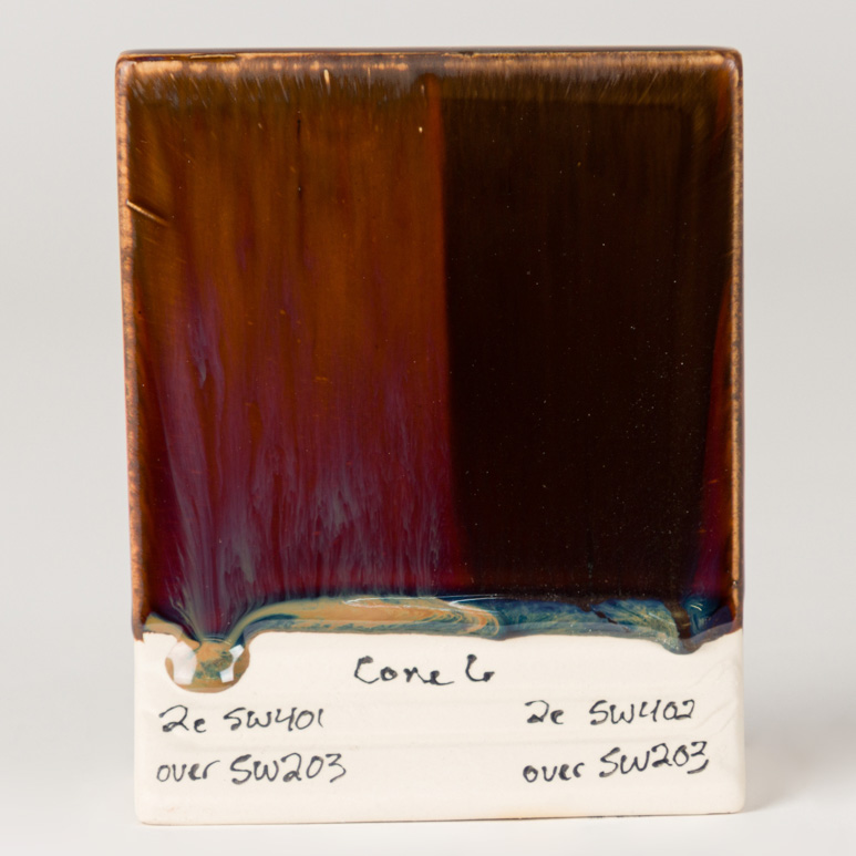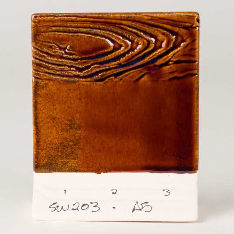 Kägla 6 oxidation (1230°C): Root Beer ger en genomskinlig, rik, brun glansfärg. Designad för att ge en antydan av färg med ett lager, djupare färg med två till tre lager – men förblir genomskinlig.