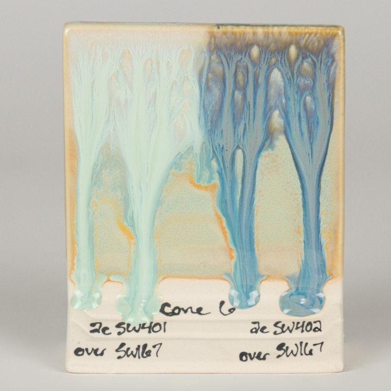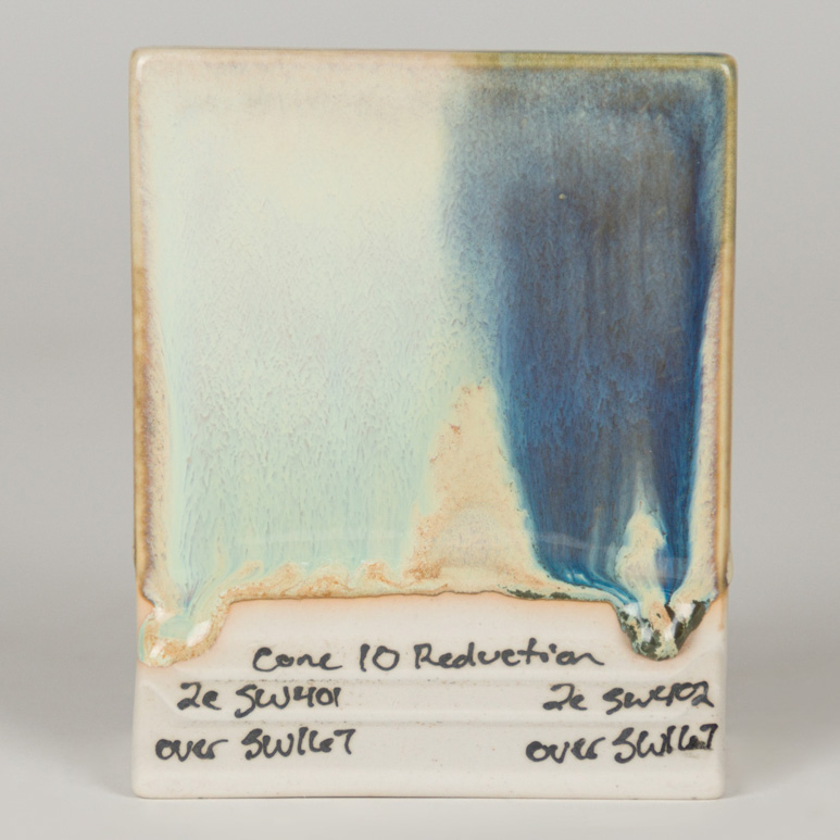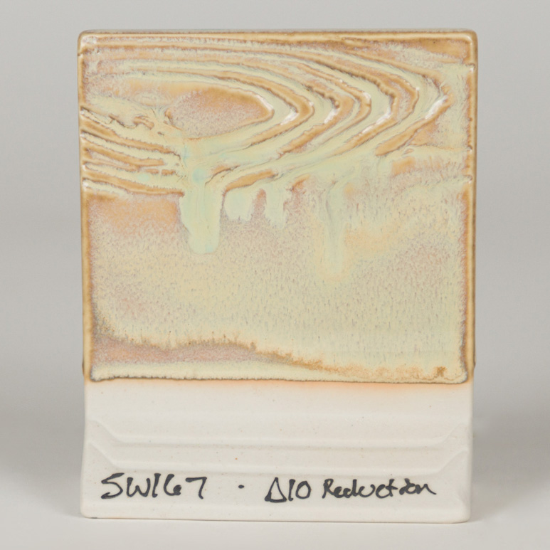 Kägla 6 oxidation (större bild): Sand & Sea är en semi-opak glansig glasyr som visar nyanser av ljusgrönt och guld. Glasyrens variation beror på appliceringen. Ju tjockare applicering, desto mer homogen blir färgen. Glasyren blir genomskinlig där den är tunnare och poolar mörkare runt ytor med textur.