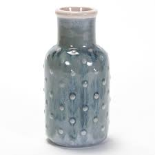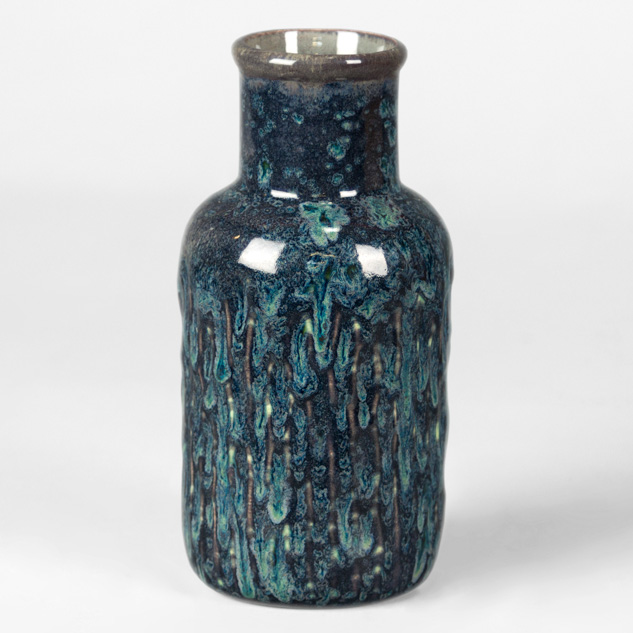 Kägla 6 oxidation (1240 °C): Färgen ändras till en halvtransparent, flammig brun/blå ton som bryter över struktur och samlas i blå partier. Ökad rörlighet. Ytproblem kan förekomma.