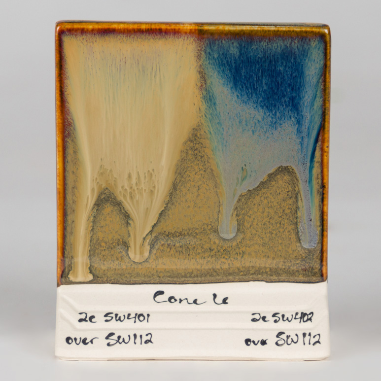 Kägla 6 oxidation (1230°C): Tiger's Eye skiftar från en blank, djupt brunröd till skummande bärnsten beroende på appliceringstjockleken. Ett till två lager ger brunt och rött, tre till fem lager ger mer glasyrrörelse och färgvariation. Även om du kommer att uppleva en vacker rörelse med Tiger's Eye kommer glasyren inte att rinna av ditt föremål under en oxidationsbränning i kägla 6.