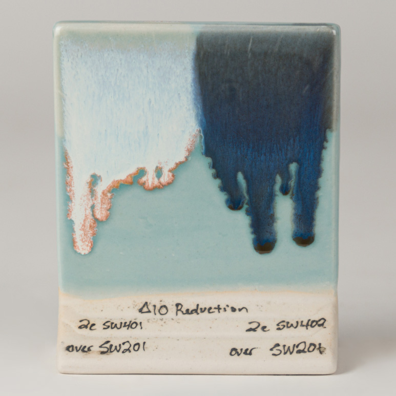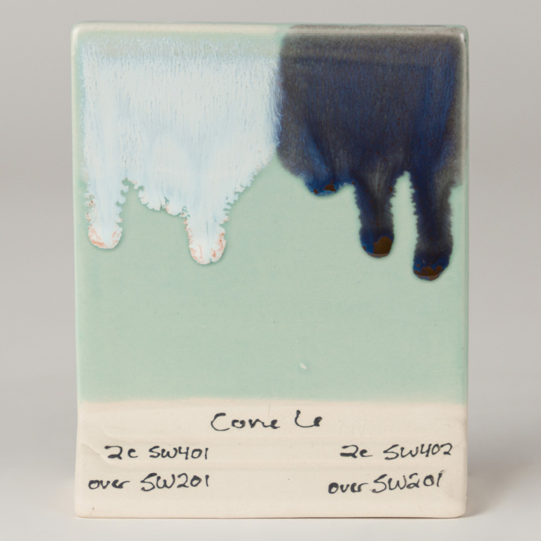 Kägla 6 oxidation (1230°C): Turquoise Ice ger en genomskinlig, blå-grön glansfärg. Designad för att ge en hint av färg med ett lager, djupare färg med två till tre lager – men förblir genomskinlig.